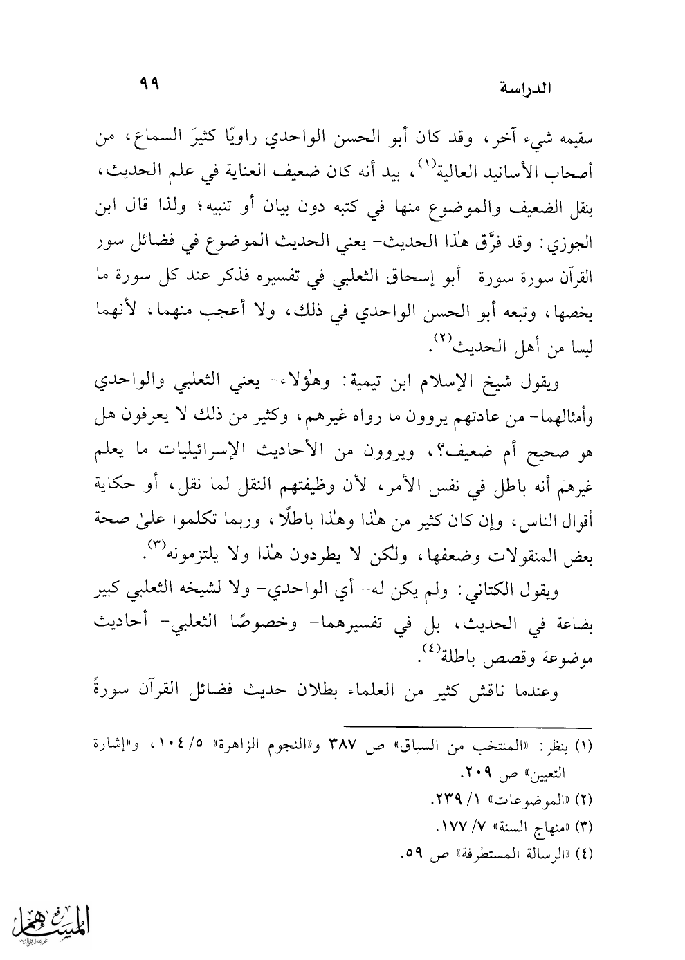 سقيمه شيء آخر، وقد كان أبو الحسن الواحدي راويًا كثير السماع، من أصحاب الأسانيد العالية (¬1)، بيد أنه كان ضعيف العناية في علم الحديث، ينقل الضعيف والموضوع منها في كتبه دون بيان أو تنبيه؛ ولذا قال ابن الجوزي: وقد فرَّق هذا الحديث -يعني الحديث الموضوع في فضائل سور القرآن سورة سورة- أبو إسحاق الثعلبي في تفسيره فذكر عند كل سورة ما يخصها، وتبعه أبو الحسن الواحدي في ذلك، ولا أعجب منهما، لأنهما ليسا من أهل الحديث (¬2).