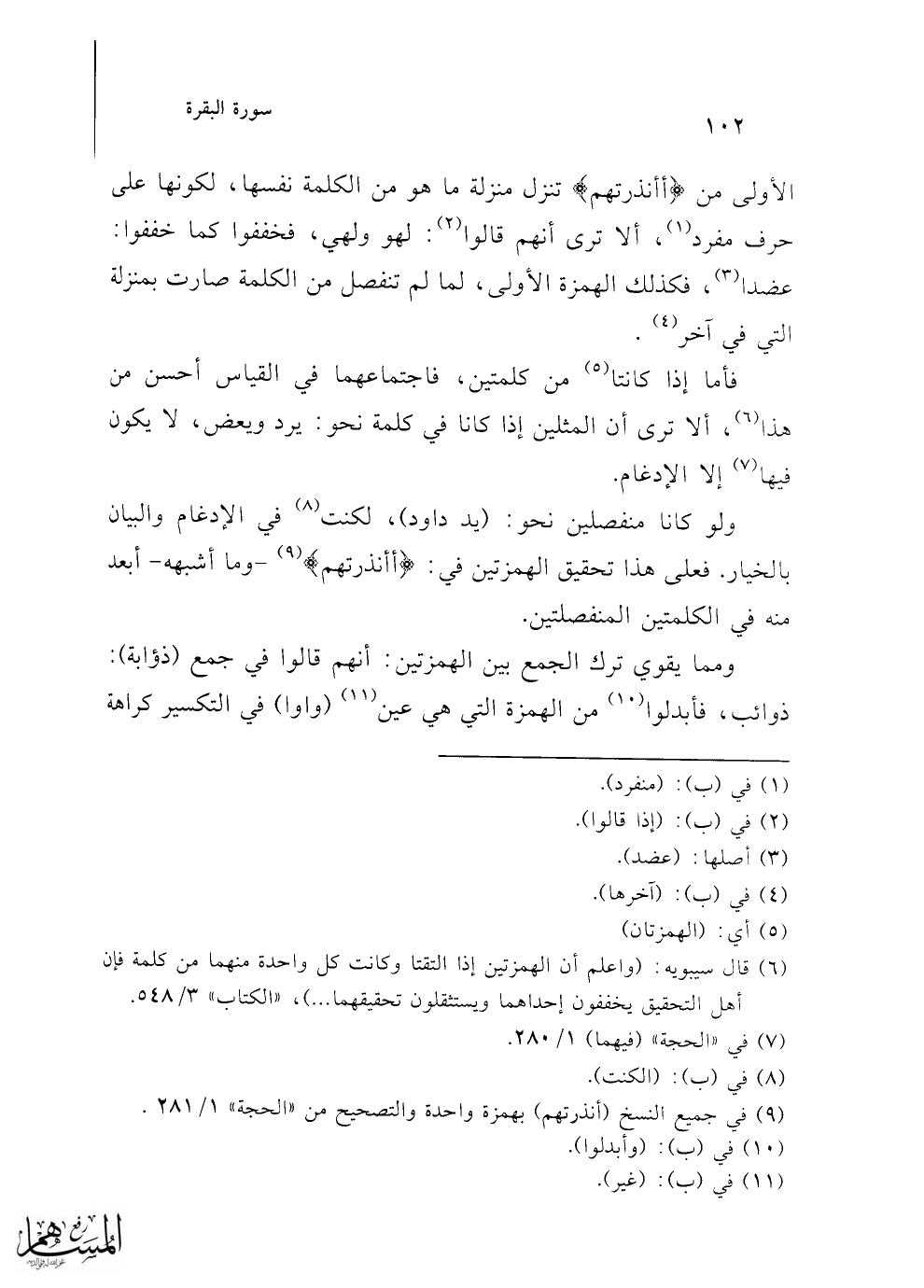 (¬9) في جميع النسخ (أنذرتهم) بهمزة واحدة والتصحيح من "الحجة" 1/ 281.