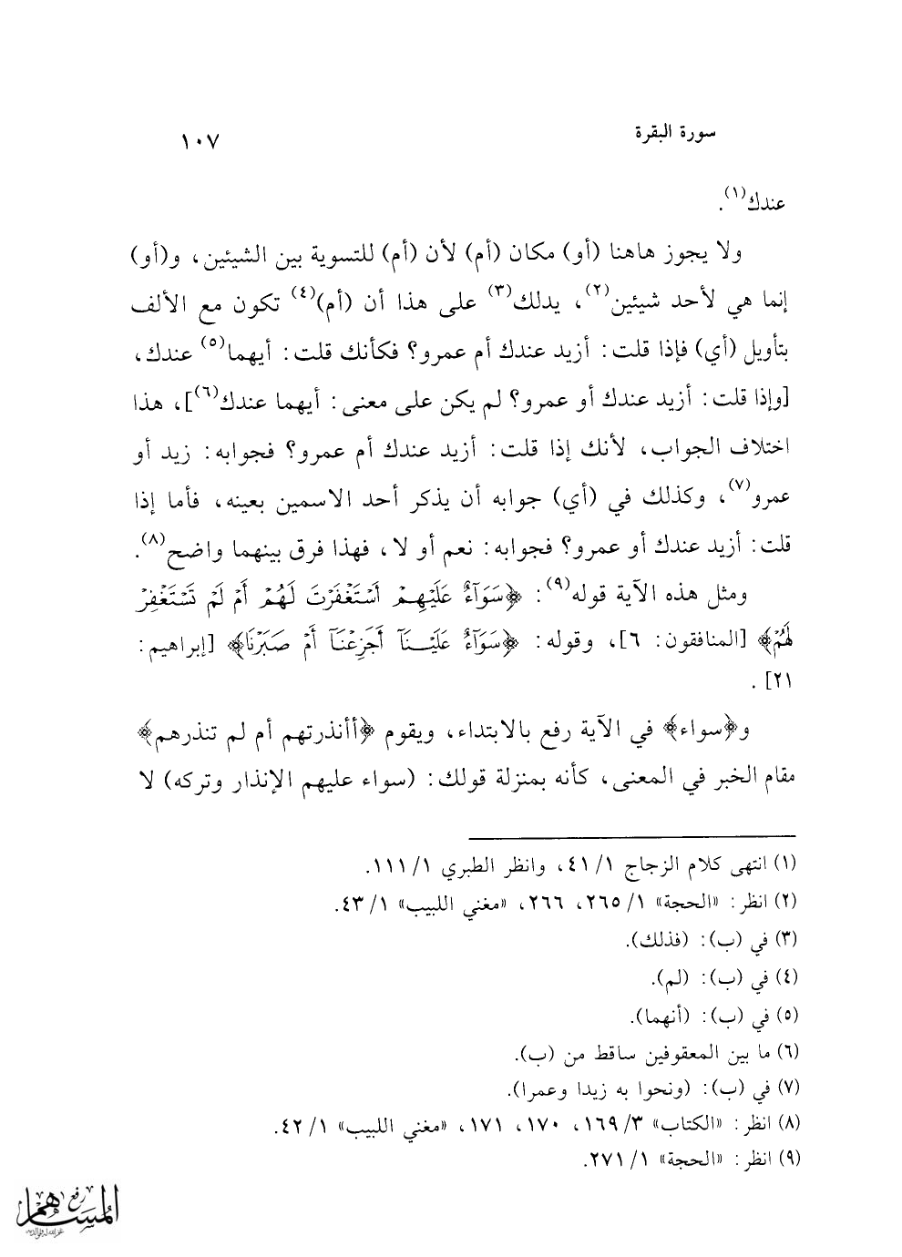 (¬2) انظر: "الحجة" 1/ 265، 266، "مغني اللبيب" 1/ 43.