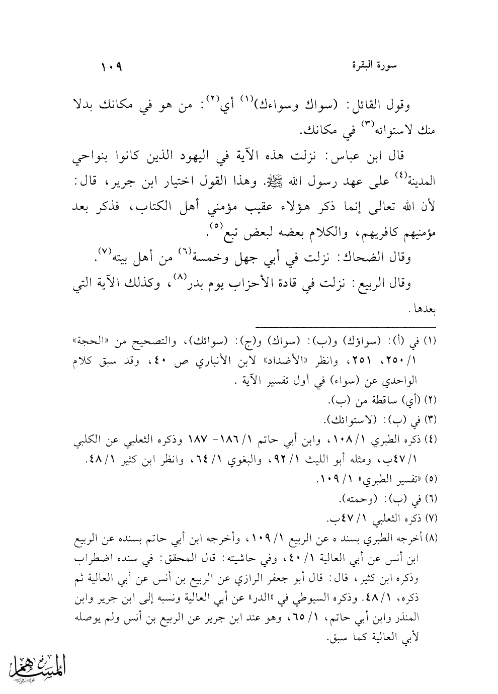 (¬1) في (أ): (سواؤك) و (ب): (سواك) و (ج): (سوائك)، والتصحيح من "الحجة" 1/ 250، 251، وانظر "الأضداد" لابن الأنباري ص 40، وقد سبق كلام الواحدي عن (سواء) في أول تفسير الآية.