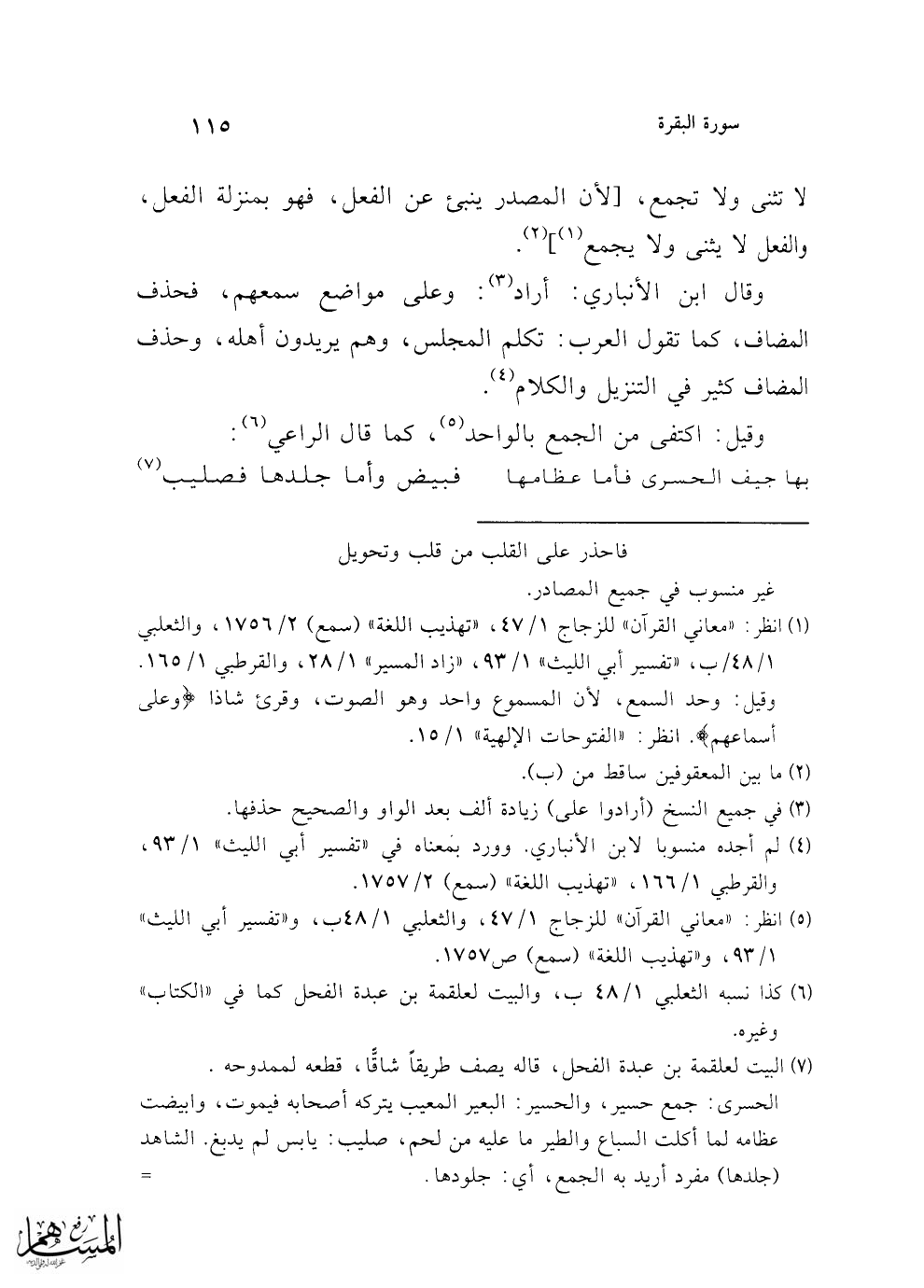 (¬4) لم أجده منسوبا لابن الأنباري. وورد بمعناه في "تفسير أبي الليث" 1/ 93، والقرطبي 1/ 166، "تهذيب اللغة" (سمع) 2/ 1757.