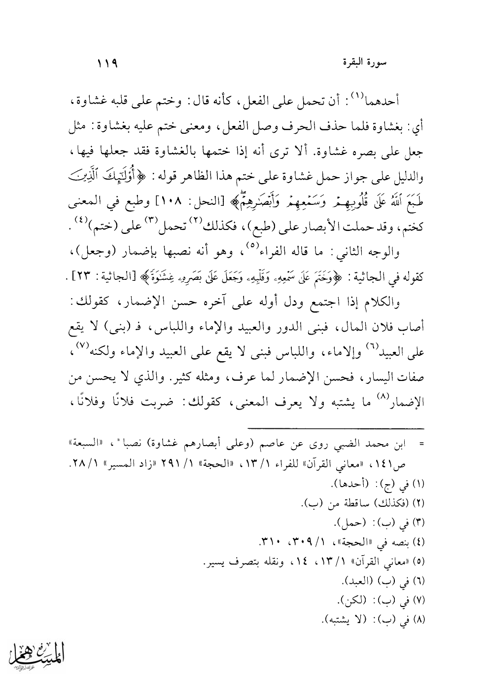 = ابن محمد الضبي روى عن عاصم (وعلى أبصارهم غشاوة) نصبا"، "السبعة" ص 141، "معاني القرآن" للفراء1/ 13، "الحجة" 1/ 291 "زاد المسير" 1/ 28.