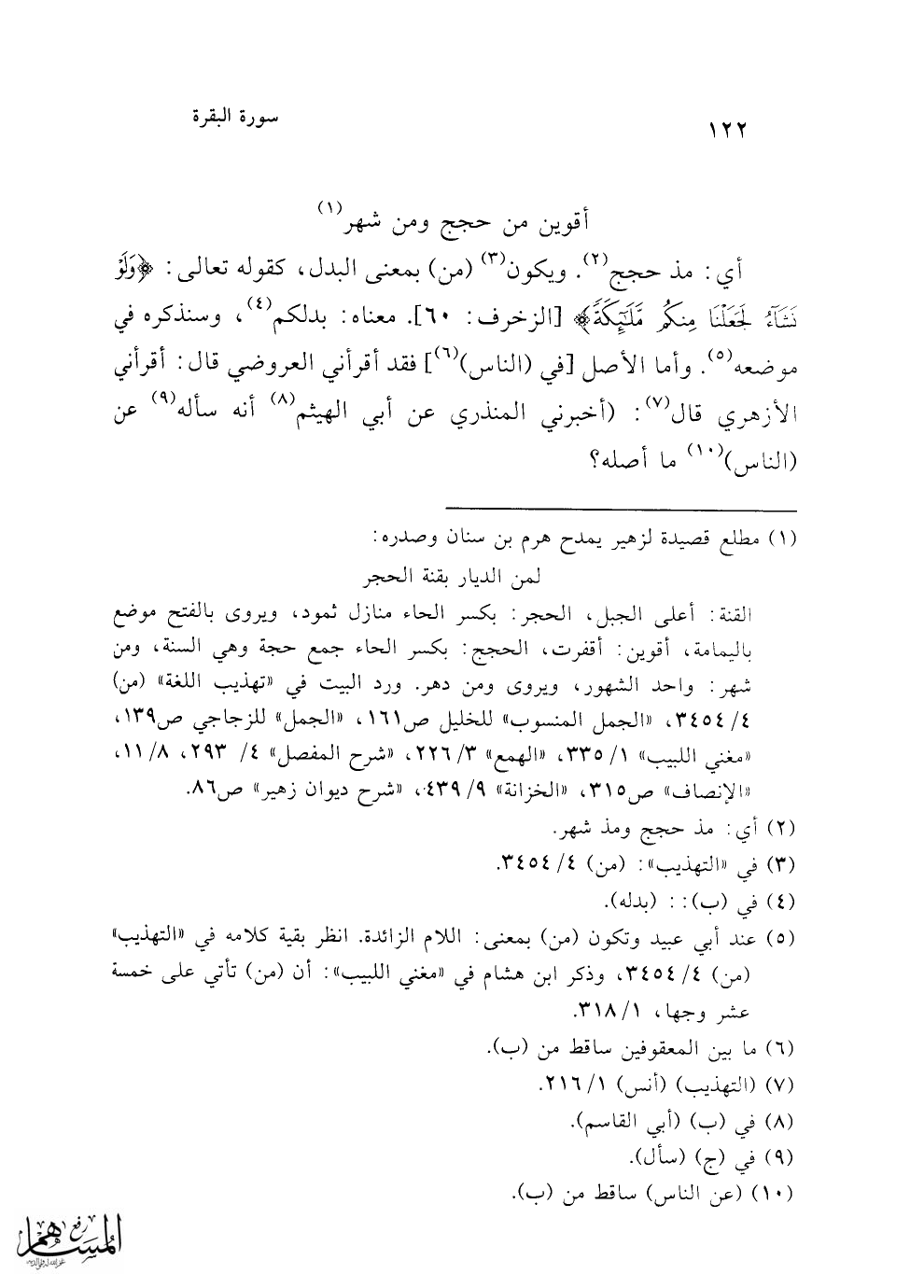 القنة: أعلى الجبل، الحجر: بكسر الحاء منازل ثمود، ويروى بالفتح موضع باليمامة، أقوين: أقفرت، الحجج: بكسر الحاء جمع حجة وهي السنة، ومن شهر: واحد الشهور، ويروى ومن دهر. ورد البيت في "تهذيب اللغة" (من) 4/ 3454، "الجمل المنسوب" للخليل ص 161، "الجمل" للزجاجي ص 139، "مغني اللبيب" 1/ 335، "الهمع" 3/ 226، "شرح المفصل" 4/ 293،8/ 11، "الإنصاف" ص 315، "الخزانة" 9/ 439، "شرح ديوان زهير" ص 86.