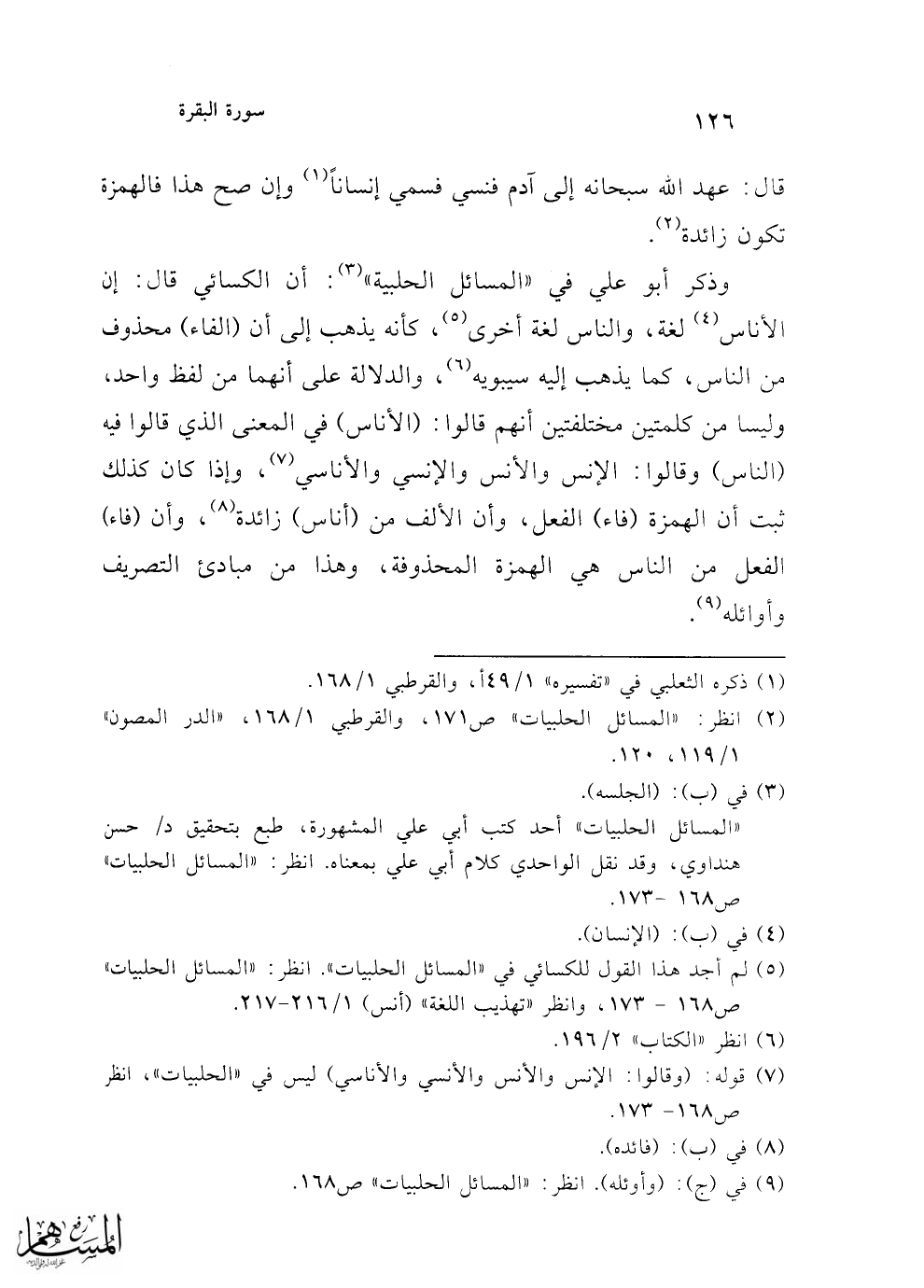 (¬2) انظر: "المسائل الحلبيات" ص 171، والقرطبي 1/ 168، "الدر المصون" 1/ 119 ,120.