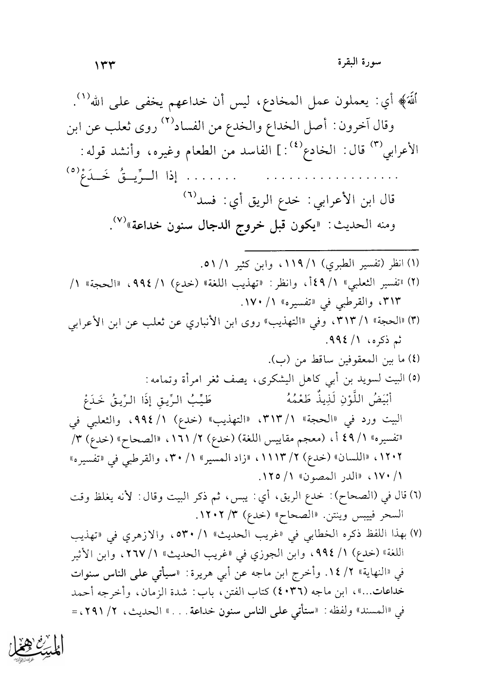 (¬2) "تفسير الثعلبي" 1/ 49 أ، وانظر. "تهذيب اللغة" (خدع) 1/ 994، "الحجة" 1/ 313، والقرطبي في "تفسير" 1/ 170.