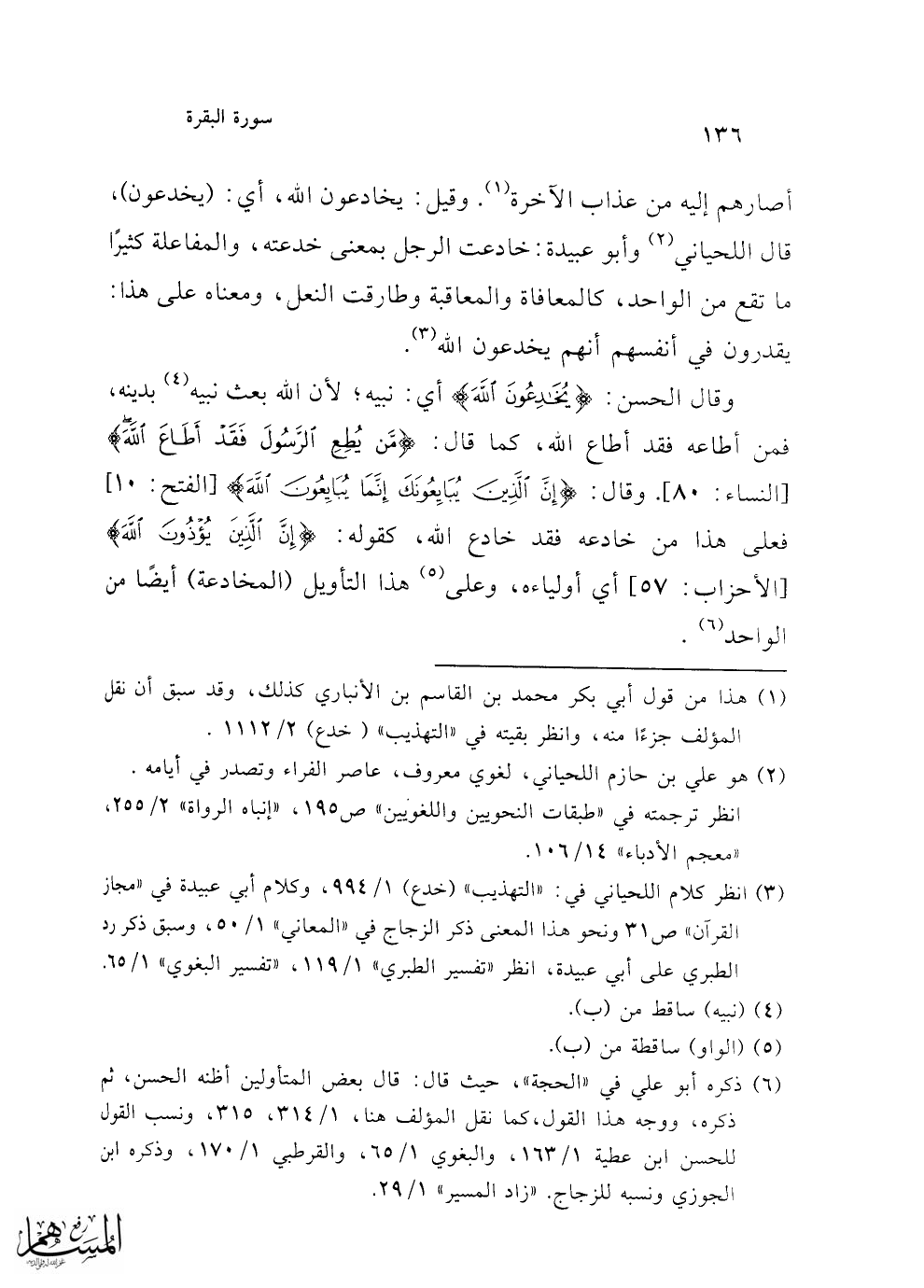 (¬3) انظر كلام اللحياني في: "التهذيب" (خدع) 1/ 994، وكلام أبي عبيدة في "مجاز القرآن" ص 31 ونحو هذا المعنى ذكر الزجاج في "المعاني" 1/ 50، وسبق ذكر رد الطبري على أبي عبيدة، انظر "تفسير الطبري" 1/ 119، "تفسير البغوي" 1/ 65.