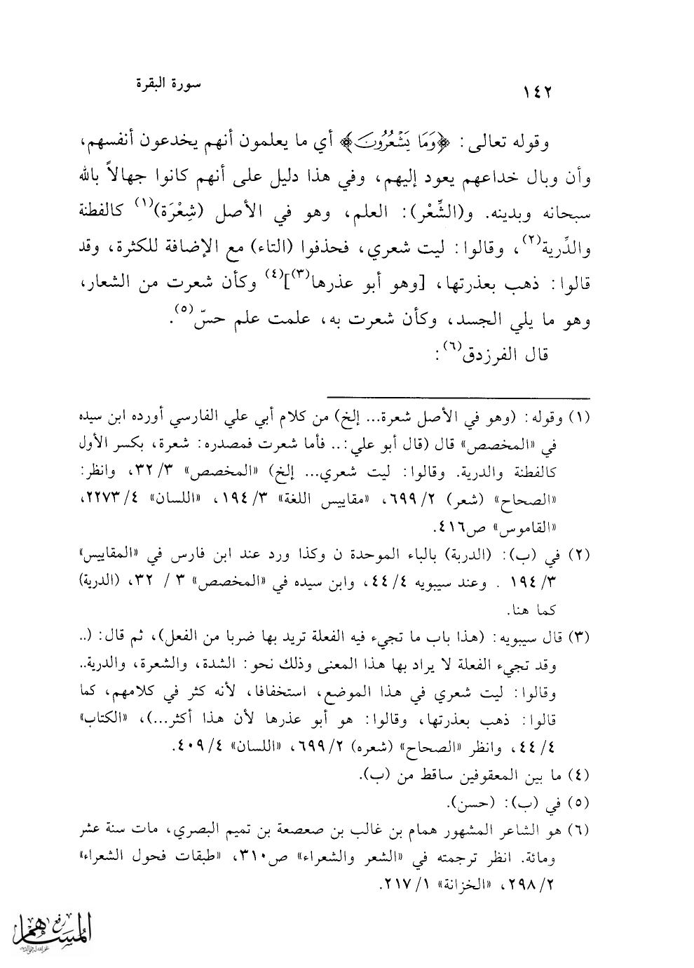 (¬1) وقوله: (وهو في الأصل شعرة ... إلخ) من كلام أبي علي الفارسي أورده ابن سيده في "المخصص" قال (قال أبو علي: .. فأما شعرت فمصدره: شعرة، بكسر الأول كالفطنة والدرية. وقالوا: ليت شعري ... إلخ) "المخصص" 3/ 32، وانظر: "الصحاح" (شعر) 2/ 699، "مقاييس اللغة" 3/ 194، "اللسان" 4/ 2273، "القاموس" ص 416.