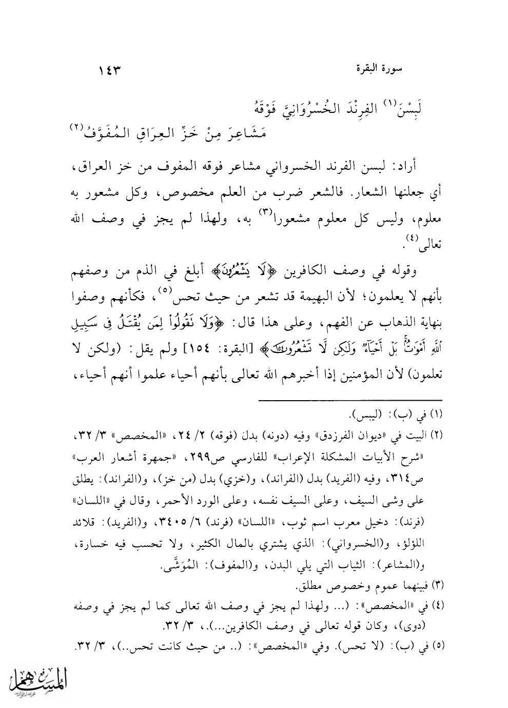 أراد: لبسن الفرند الخسرواني مشاعر فوقه المفوف من خز العراق، أي جعلنها الشعار. فالشعر ضرب من العلم مخصوص، وكل مشعور به معلوم، وليس كل معلوم مشعورا (¬3) به، ولهذا لم يجز في وصف الله تعالى (¬4).