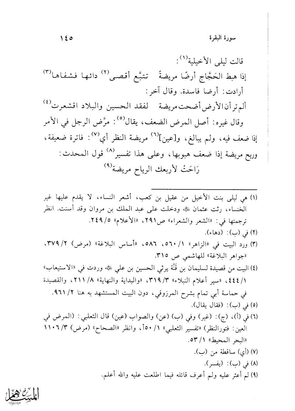 (¬3) ورد البيت في "الزاهر" 1/ 560، 586، "أساس البلاغة" (مرض) 2/ 379، "جواهر البلاغة" للهاشمي ص 315.