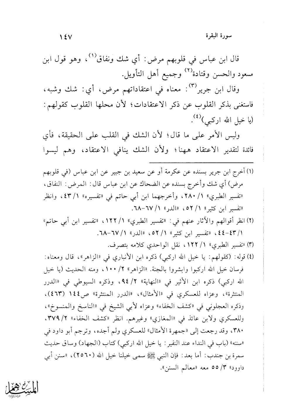 (¬1) أخرج ابن جرير بسنده عن عكرمة أو عن سعيد بن جبير عن ابن عباس (في قلوبهم مرض) أي شك وأخرج بسنده عن الضحاك عن ابن عباس قال: المرض: النفاق، "تفسير الطبري" 1/ 280، وأخرجهما ابن أبي حاتم في "تفسيره" 1/ 43، وانظر "تفسير ابن كثير" 1/ 52، "الدر" 1/ 67 - 68.