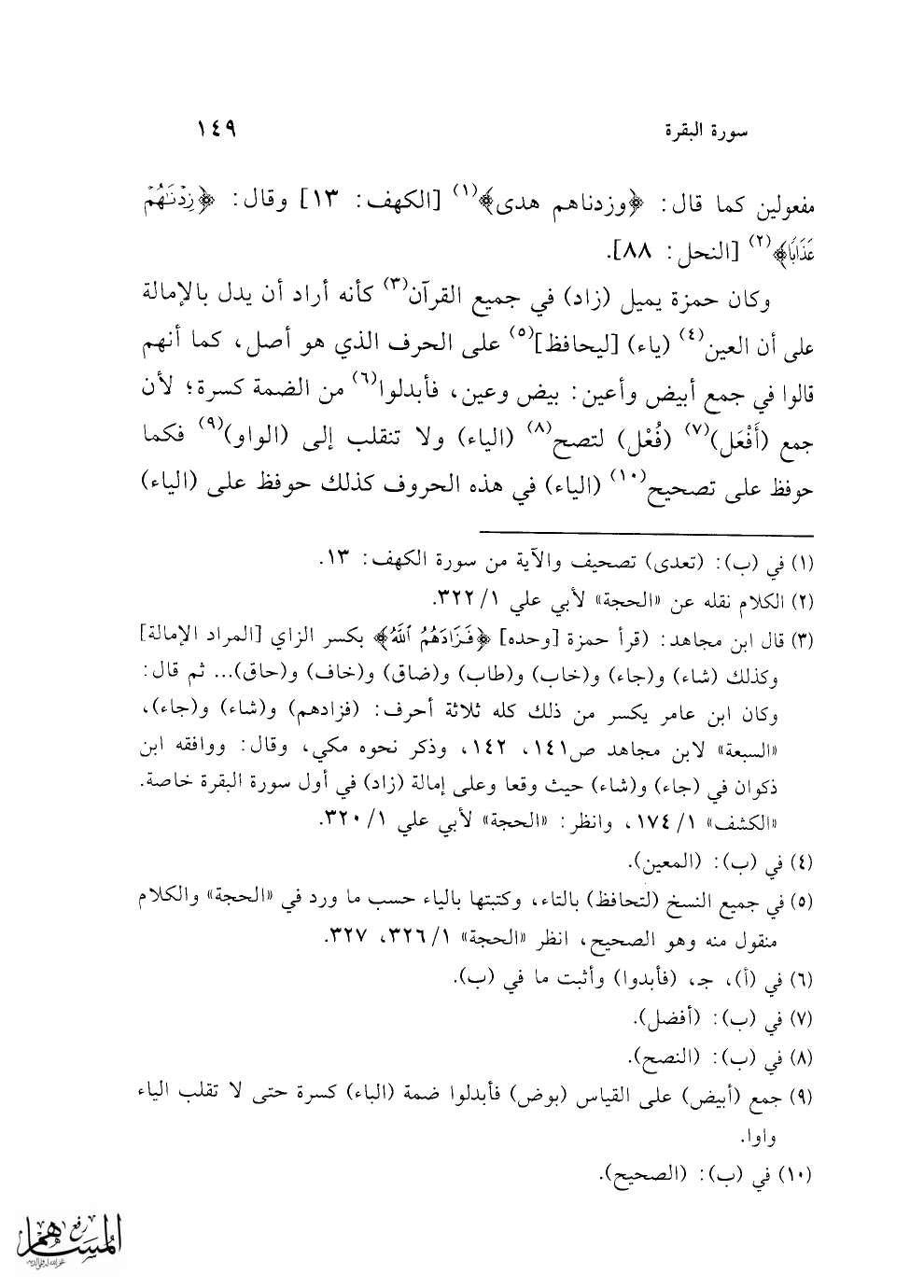 (¬5) في جميع النسخ (لتحافظ) بالتاء، وكتبتها بالياء حسب ما ورد في "الحجة" والكلام منقول منه وهو الصحيح، انظر "الحجة"1/ 326، 327.
