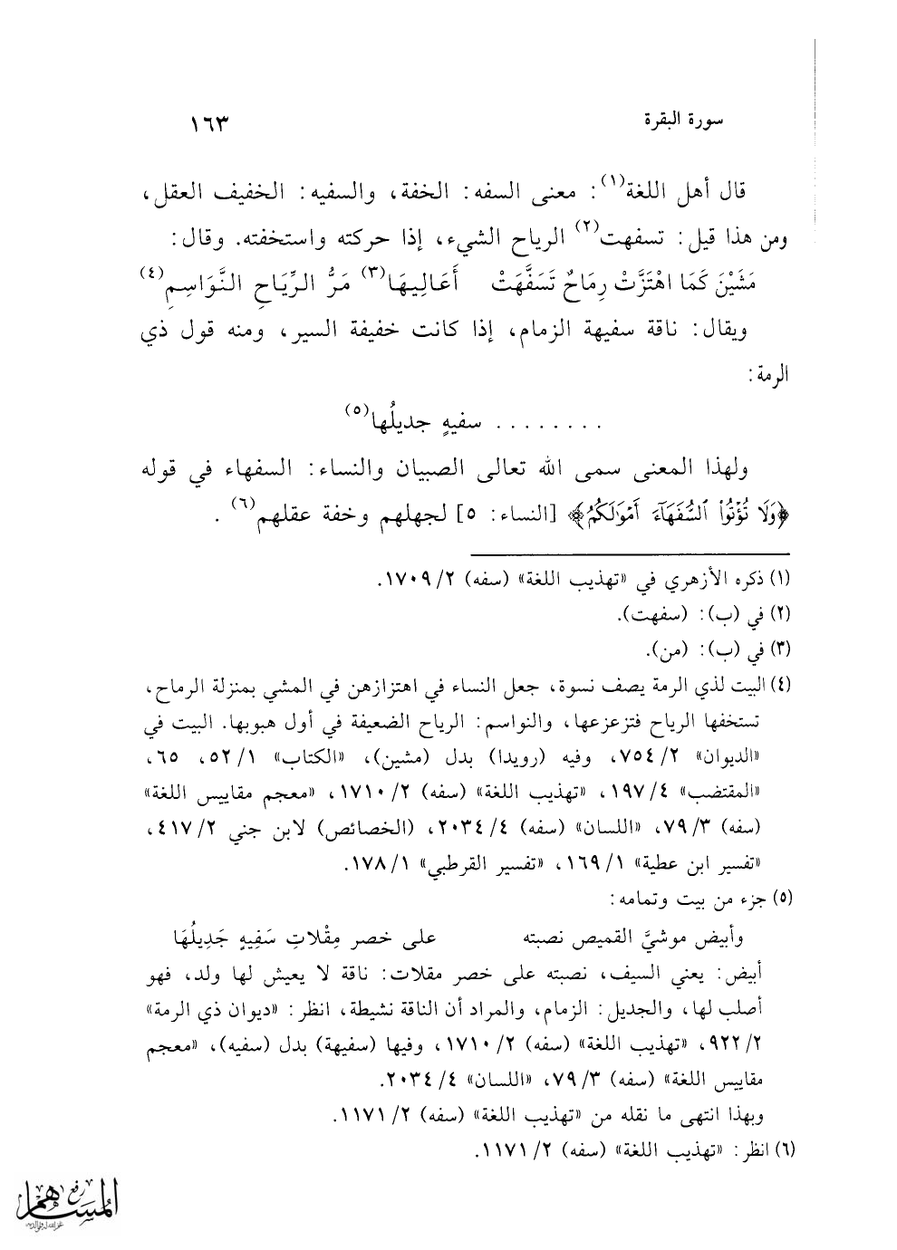 وبهذا انتهى ما نقله من "تهذيب اللغة" (سفه) 2/ 1171.