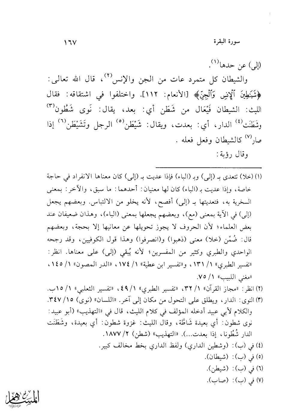 والشيطان كل متمرد عات من الجن والإنس (¬2)، قال الله تعالى. {شَيَاطِينَ الْإِنْسِ وَالْجِنِّ} [الأنعام: 112]. واختلفوا في اشتقاقه: فقال الليث: الشيطان فَيْعَال من شَطَن أي: بعد، يقال: نَوى شَطُون (¬3) وشَطَنَت (¬4) الدار، أي: بعدت، ويقال: شَيْطَن (¬5) الرجل وتَشَيْطَن (¬6) إذا صار (¬7) كالشيطان وفعل فعله.
