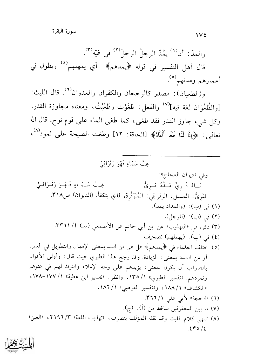 (¬5) اختلف العلماء في {يَمُدُّهُمْ} هل هي من المد بمعنى الإمهال والتطويل فىِ العمر. أو من المدد بمعنى: الزيادة. وقد رجح هذا الطبري حيث قال: وأولى الأقوال بالصواب أن يكون بمعنى: يزيدهم على وجه الإملاء والترك لهم في عتوهم وتمردهم. "تفسير الطبري" 1/ 135، وانظر: "تفسير أبن عطية" 1/ 177 - 178، "الكشاف" 1/ 188، و"تفسير القرطبي" 1/ 182.