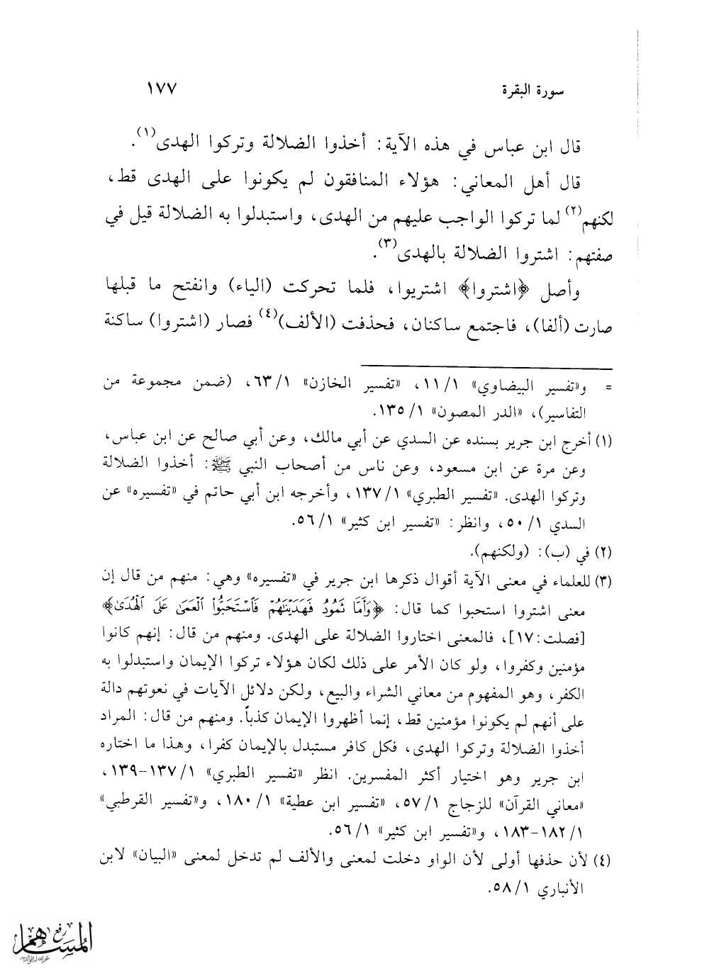(¬1) أخرج ابن جرير بسنده عن السدي عن أبي مالك، وعن أبي صالح عن ابن عباس، وعن مرة عن ابن مسعود، وعن ناس من أصحاب النبي - صلى الله عليه وسلم -: أخذوا الضلالة وتركوا الهدى. "تفسير الطبري" 1/ 137، وأخرجه ابن أبي حاتم في "تفسيره" عن السدي 1/ 50، وانظر. "تفسير ابن كثير" 1/ 56.