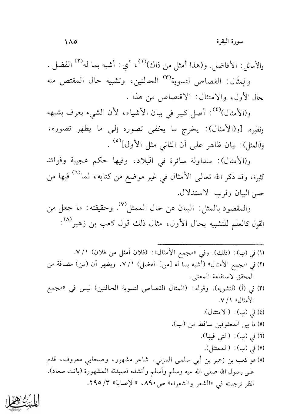 والمقصود بالمثل: البيان عن حال الممثل (¬7). وحقيقته: ما جعل من القول كالعلم للتشبيه بحال الأول، مثال ذلك قول كعب بن زهير (¬8):
