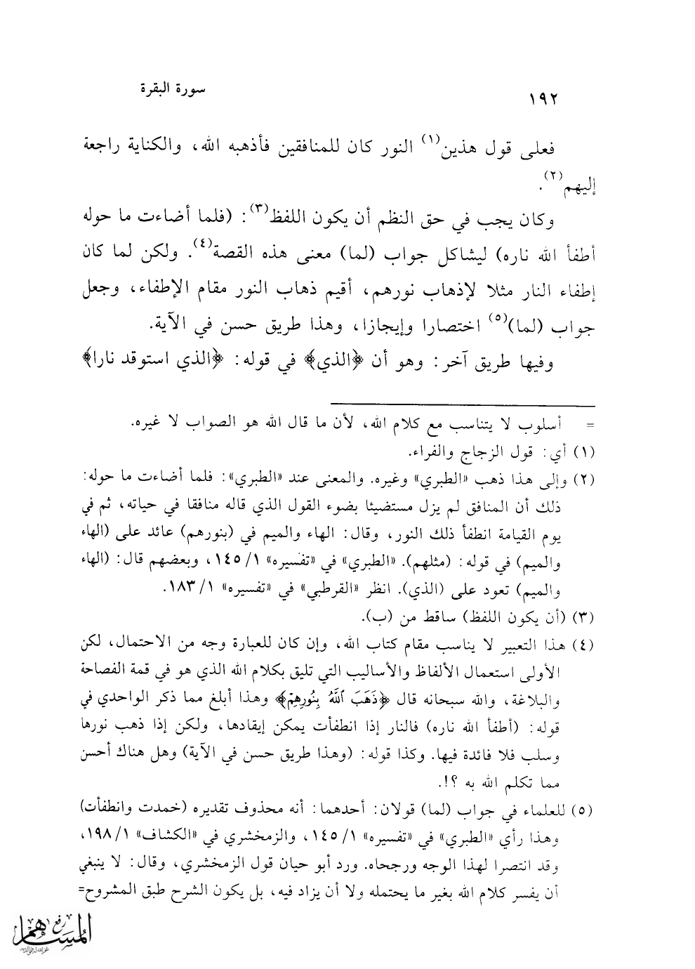 (¬4) هذا التعبير لا يناسب مقام كتاب الله، وإن كان للعبارة وجه من الاحتمال، لكن الأولى استعمال الألفاظ والأساليب التي تليق بكلام الله الذي هو في قمة الفصاحة والبلاغة، والله سبحانه قال {ذَهَبَ اللَّهُ بِنُورِهِمْ} وهذا أبلغ مما ذكر الواحدي في قوله: (أطفأ الله ناره) فالنار إذا انطفأت يمكن إيقادها، ولكن إذا ذهب نورها وسلب فلا فائدة فيها. وكذا قوله: (وهذا طريق حسن في الآية) وهل هناك أحسن مما تكلم الله به؟!.