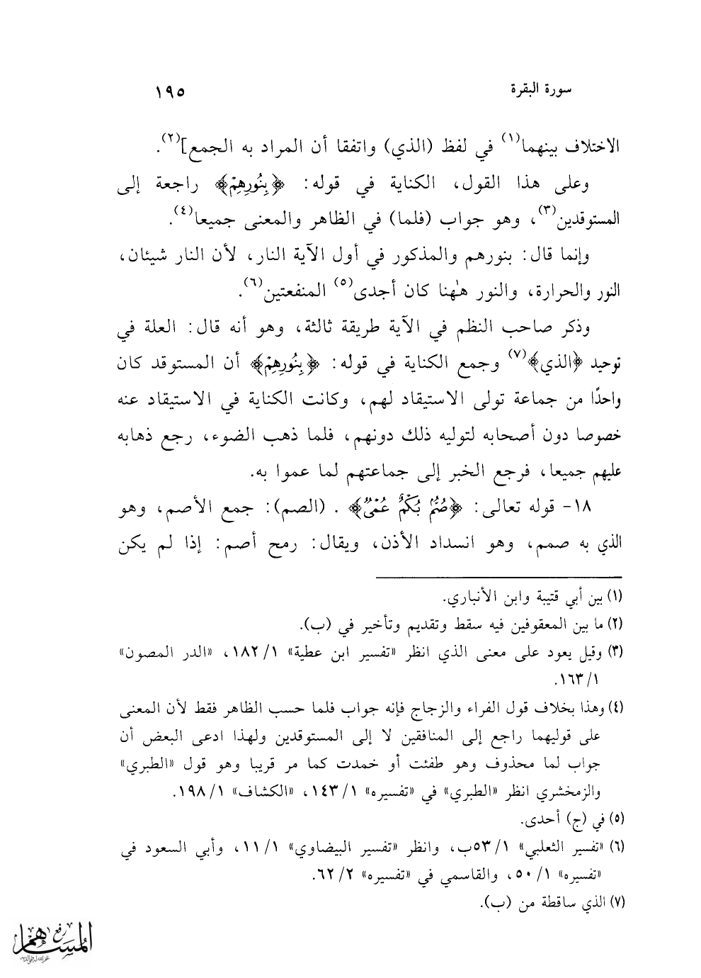 وعلى هذا القول، الكناية في قوله: {بِنُورِهِم} راجعة إلى المستوقدين (¬3)، وهو جواب (فلما) في الظاهر والمعنى جميعا (¬4).