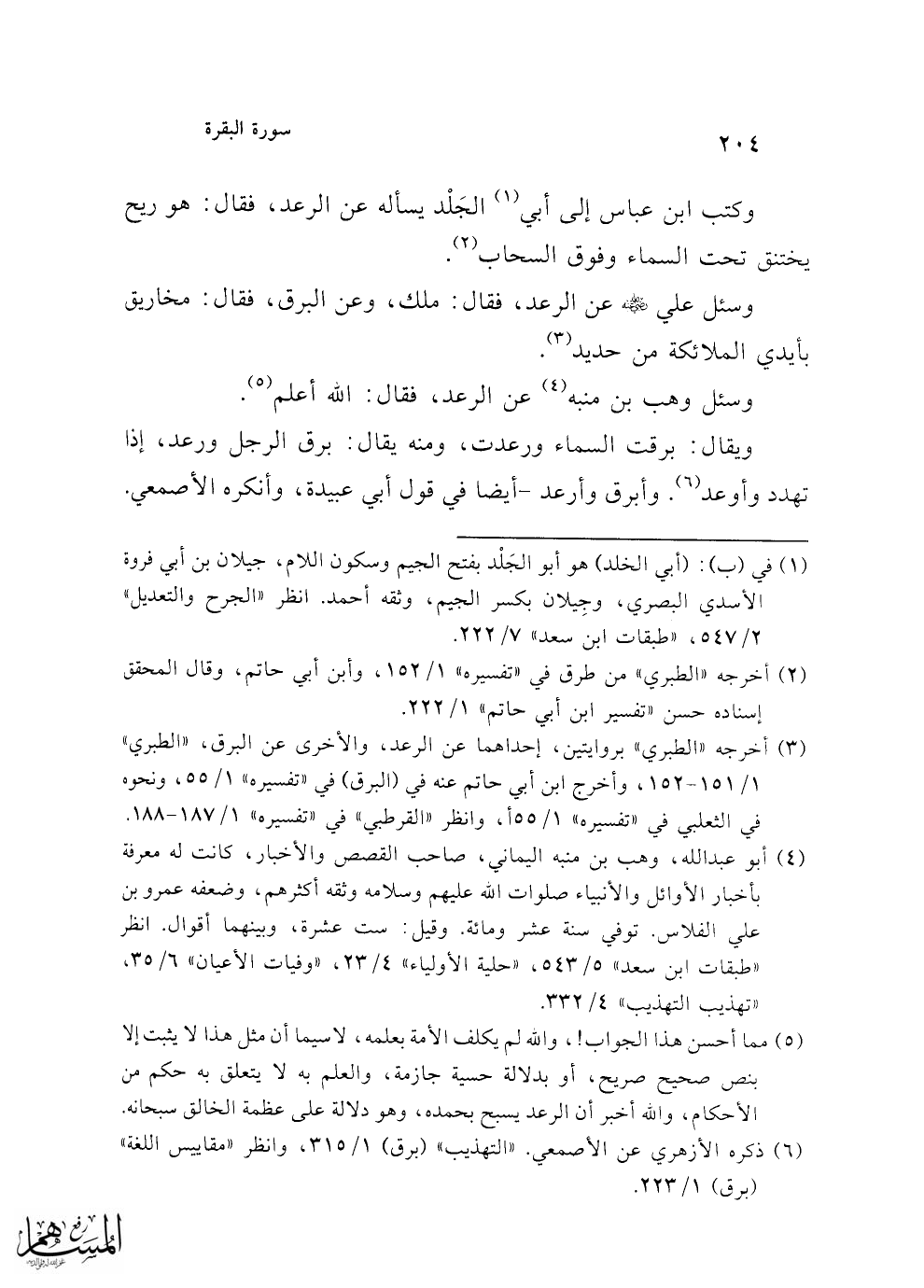 (¬3) أخرجه "الطبري" بروايتين، إحداهما عن الرعد، والأخرى عن البرق، "الطبري" 1/ 151 - 152، وأخرج ابن أبي حاتم عنه في (البرق) في "تفسيره" 1/ 55، ونحوه في الثعلبي في "تفسيره" 1/ 55 أ، وانظر "القرطبي" في "تفسيره" 1/ 187 - 188.