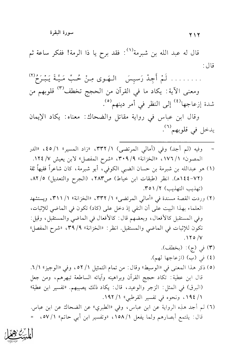 (¬5) ذكر هذا المعنى في "الوسيط" وقال: من تمام التمثيل 1/ 52، وفي "الوجيز" 1/ 6. قال ابن عطية: تكاد حجج القرآن وبراهينه وآياته الساطعة تبهرهم، ومن جعل (البرق) في المثل: الزجر والوعيد، قال: يكاد ذلك يصيبهم. "تفسير ابن عطية" 1/ 194، ونحوه في "تفسير القرطبي" 1/ 192.