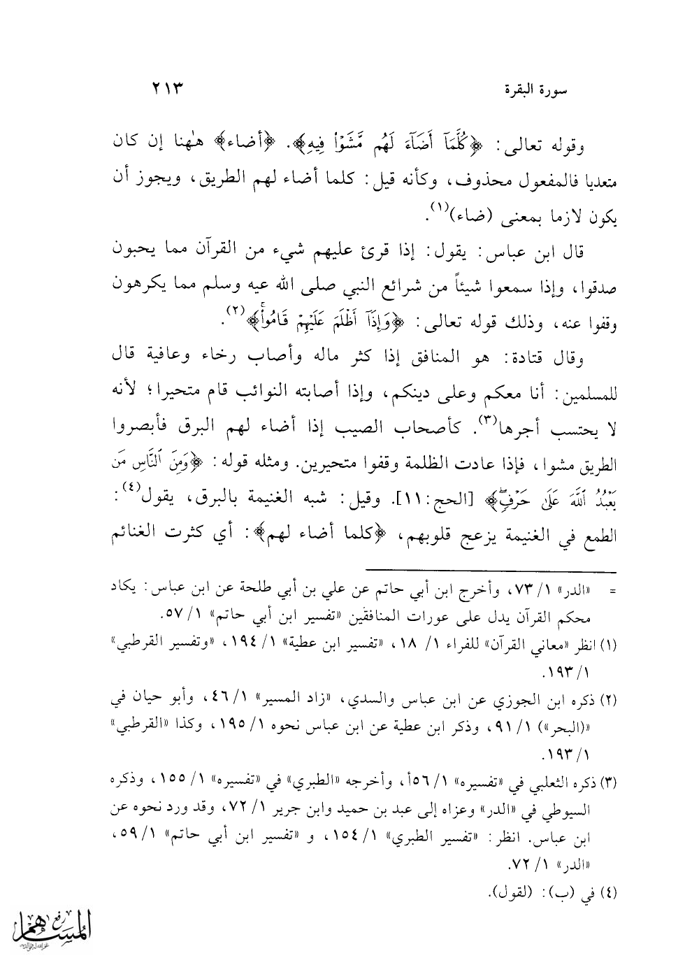 وقال قتادة: هو المنافق إذا كثر ماله وأصاب رخاء وعافية قال للمسلمين: أنا معكم وعلى دينكم، وإذا أصابته النوائب قام متحيرا؛ لأنه لا يحتسب أجرها (¬3). كأصحاب الصيب إذا أضاء لهم البرق فأبصروا الطريق مشوا، فإذا عادت الظلمة وقفوا متحيرين. ومثله قوله: {وَمِنَ النَّاسِ مَنْ يَعْبُدُ اللَّهَ عَلَى حَرْفٍ} [الحج:11]. وقيل: شبه الغنيمة بالبرق، يقول (¬4): الطمع في الغنيمة يزعج قلوبهم، {كُلَّمَا أَضَاءَ لَهُمْ}: أي كثرت الغنائم