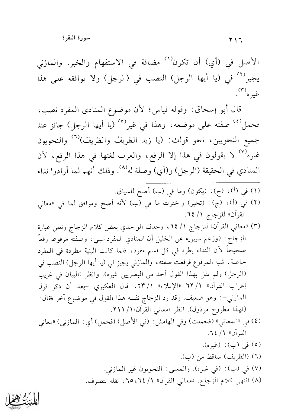 (¬3) "معاني القرآن" للزجاج 1/ 64، وحذف الواحدي بعض كلام الزجاج ونص عبارة الزجاج: (وزعم سيبويه عن الخليل أن المنادي المفرد مبني، وصفته مرفوعة رفعاً صحيحاً لأن النداء يطرد في كل اسم مفرد، فلما كانت البنية مطردة في المفرد خاصة، شبه المرفوع فرفعت صفته، والمازني يجيز في (يا أيها الرجل) النصب في (الرجل) ولم يقل بهذا القول أحد من البصريين غيره). وانظر "البيان في غريب إعراب القرآن" 1/ 62 "الإملاء" 1/ 23، قال العبكري -بعد أن ذكر قول المازني-: وهو ضعيف. وقد رد الزجاج نفسه هذا القول في موضوع آخر فقال: (فهذا مطروح مرذول). انظر "معاني القرآن" 1/ 211.
