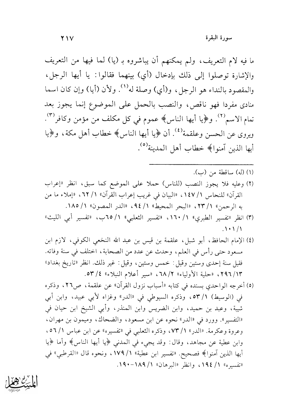 (¬5) أخرجه الواحدي بسنده في كتابه "أسباب نزول القرآن" عن علقمة، ص 26، وذكره في (الوسيط) 1/ 53، وذكره السيوطي في "الدر" وغزاه لأبي عبيد، وابن أبي شيبة، وعبد بن حميد، وابن الضريس وابن المنذر، وأبي الشيخ أبن حيان في "التفسير". وورد في "الدر" نحوه عن ابن مسعود، والضحاك، وميمون بن مهران، وعروة وعكرمة. "الدر" 1/ 73، وذكره الثعلبي في "تفسيره" عن ابن عباس 1/ 56، وابن عطية عن مجاهد، وقال: وقد يجيء في المدني {يَا أَيُّهَا النَّاسُ} وأما {يَا أَيُّهَا الَّذِينَ آمَنُوا} فصحيح. "تفسير ابن عطية" 1/ 179، ونحوه قال "القرطبي" في "تفسيره" 1/ 194، وانظر "البرهان" 1/ 189 - 190.