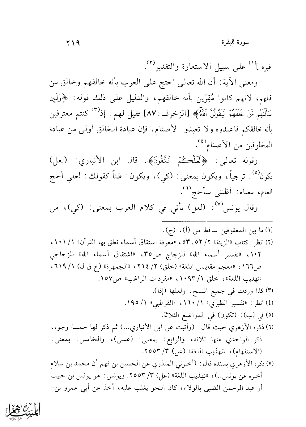 (¬7) ذكره الأزهري بسنده قال: (أخبرني المنذري عن الحسين بن فهم أن محمد بن سلام أخبره عن يونس ..)، "تهذيب اللغة" (عل) 3/ 2553. ويونس: هو يونس بن حبيب أو عبد الرحمن الضبي بالولاء، كان النحو يغلب عليه، أخذ عن أبي عمرو بن =