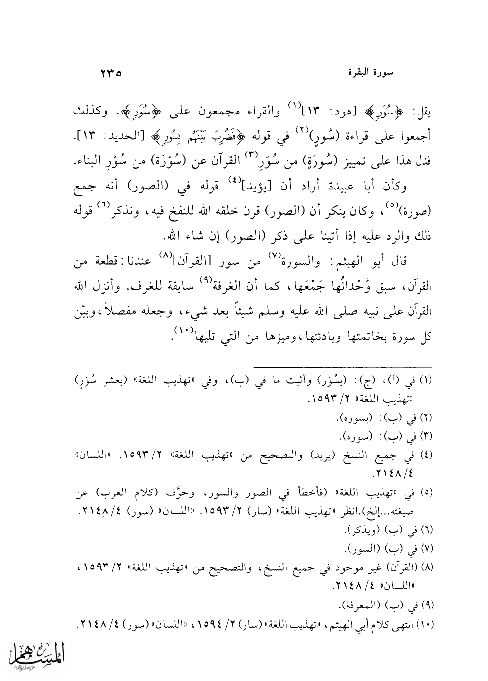 (¬5) في "تهذيب اللغة" (فأخطأ في الصور والسور، وحرَّف (كلام العرب) عن صيغته ... إلخ). انظر "تهذيب اللغة" (سار) 2/ 1593. "اللسان" (سور) 4/ 2184.
