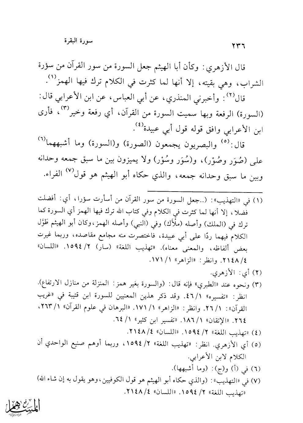 (¬1) في "التهذيب": (.. جعل السورة من سور القرآن من أسأرت سؤرا، أي: أفضلت فضلا، إلا أنها لما كثرت في الكلام وفي كتاب الله ترك فيها الهمز أي السورة كما ترك في (الملك) وأصله (ملْأَك) وفي (النبي) وأصله الهمز، وكان أبو الهيثم طَوَّل الكلام فيهما رداً على أبي عبيدة، فاختصرت منه مجامع مقاصده، وربما غيرت بعض ألفاظه، والمعنى معناه). "تهذيب اللغة" (سار) 2/ 1594. "اللسان" 4/ 2148. وانظر: "الزاهر" 1/ 171.