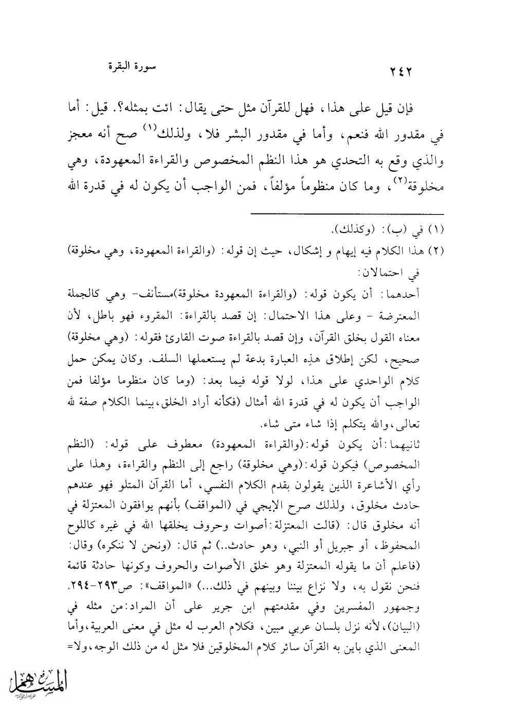 ثانيهما: أن يكون قوله: (والقراءة المعهودة) معطوف على قوله: (النظم المخصوص) فيكون قوله: (وهي مخلوقة) راجع إلى النظم والقراءة، وهذا على رأي الأشاعرة الذين يقولون بقدم الكلام النفسي، أما القرآن المتلو فهو عندهم حادث مخلوق، ولذلك صرح الإيجي في (المواقف) بأنهم يوافقون المعتزلة في أنه مخلوق قال: (قالت المعتزلة: أصوات وحروف يخلقها الله في غيره كاللوح المحفوظ، أو جبريل أو النبي، وهو حادث ..) ثم قال: (ونحن لا ننكره) وقال: (فاعلم أن ما يقوله المعتزلة وهو خلق الأصوات والحروف وكونها حادثة قائمة فنحن نقول به، ولا نزل بيننا وبينهم في ذلك ...) "المواقف": ص 293 - 294. وجمهور المفسرين وفي مقدمتهم ابن جرير على أن المراد: من مثله في (البيان)، لأنه نزل بلسان عربي مبين، فكلام العرب له مثل في معنى العربية، وأما المعنى الذي باين به القرآن سائر كلام المخلوقين فلا مثل له من ذلك الوجه، ولا =