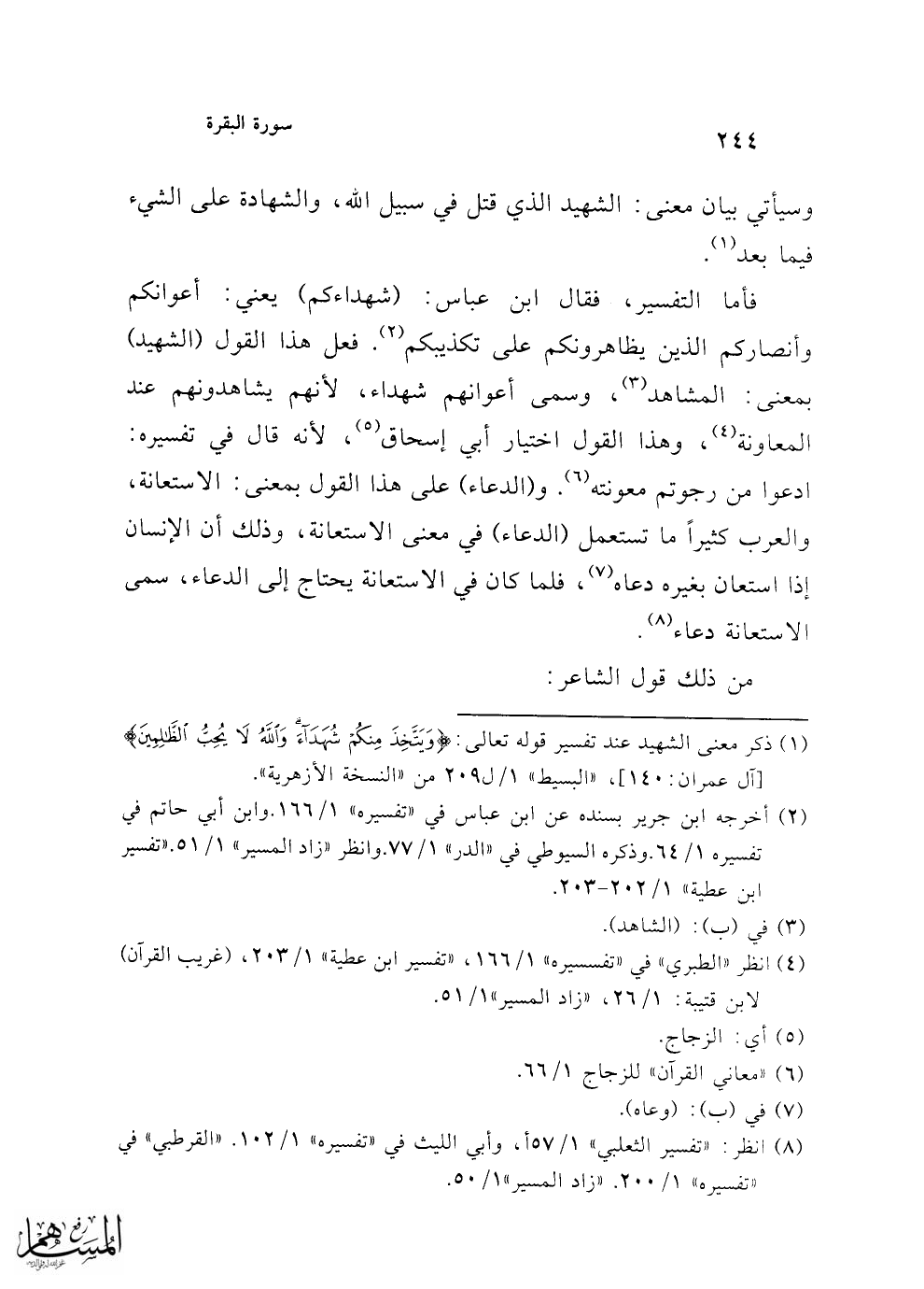 فأما التفسير، فقال ابن عباس: (شهداءكم) يعني: أعوانكم وأنصاركم الذين يظاهرونكم على تكذيبكم (¬2). فعل هذا القول (الشهيد) بمعنى: المشاهد (¬3)، وسمى أعوانهم شهداء، لأنهم يشاهدونهم عند المعاونة (¬4)، وهذا القول اختيار أبي إسحاق (¬5)، لأنه قال في تفسيره: ادعوا من رجوتم معونته (¬6). و (الدعاء) على هذا القول بمعنى: الاستعانة، والعرب كثيراً ما تستعمل (الدعاء) في معنى الاستعانة، وذلك أن الإنسان إذا إستعان بغيره دعاه (¬7)، فلما كان في الاستعانة يحتاج إلى الدعاء، سمى الاستعانة دعاء (¬8).