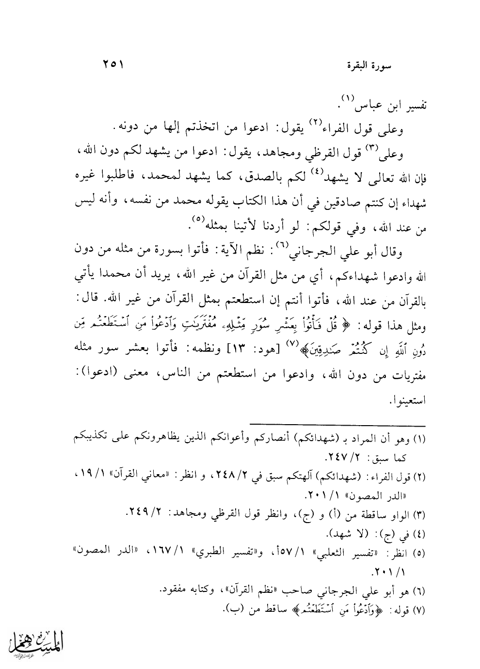 (¬1) وهو أن المراد بـ (شهدائكم) أنصاركم وأعوانكم الذين يظاهرونكم على تكذيبكم كما سبق: 2/ 247.