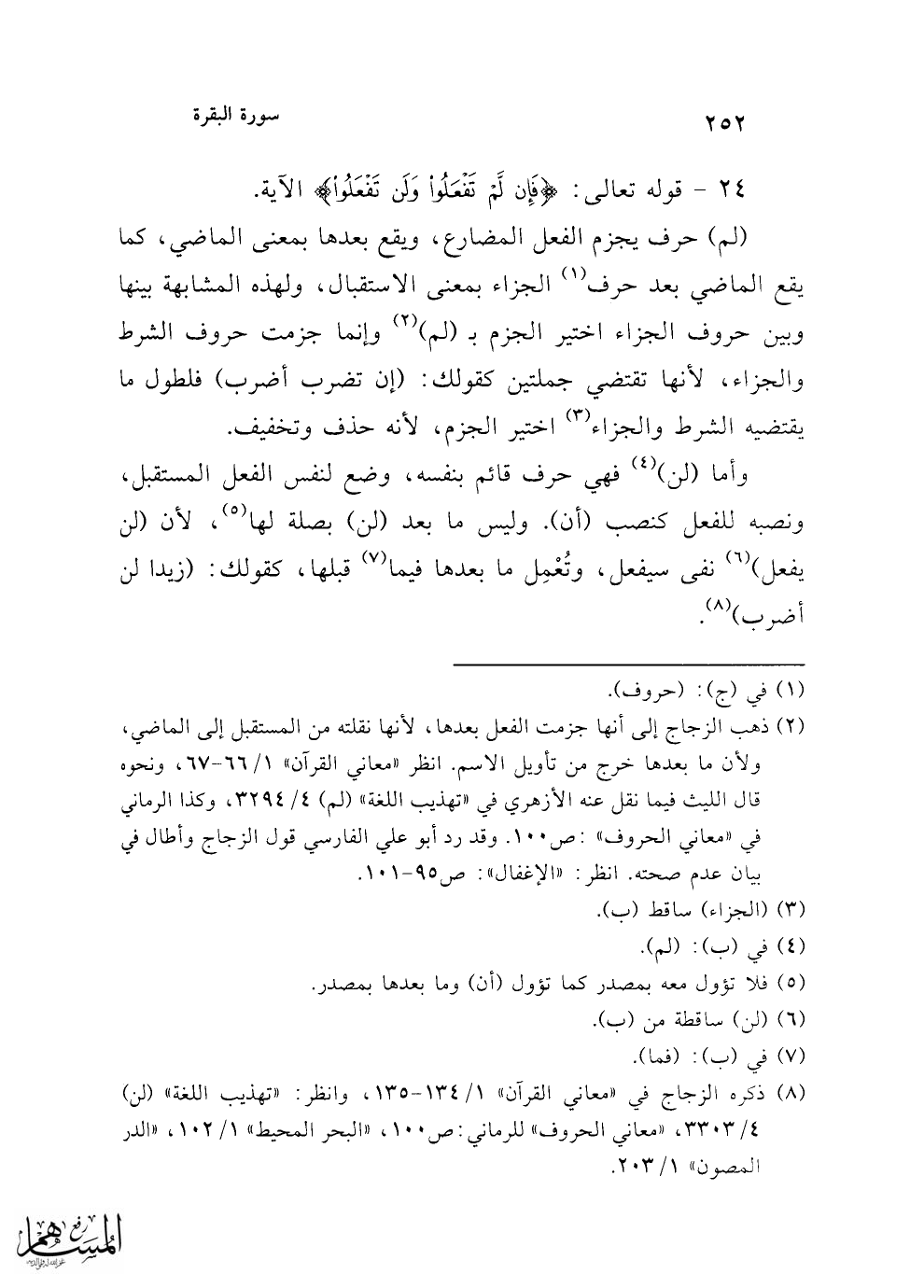 (¬2) ذهب الزجاج إلى أنها جزمت الفعل بعدها، لأنها نقلته من المستقبل إلى الماضي، ولأن ما بعدها خرج من تأويل الاسم. انظر "معاني القرآن" 1/ 66 - 67، ونحوه قال الليث فيما نقل عنه الأزهري في "تهذيب اللغة" (لم) 4/ 3294، وكذا الرماني في "معاني الحروف": ص 100. وقد رد أبو علي الفارسي قول الزجاج وأطال في بيان عدم صحته. انظر. "الإغفال". ص 95 - 101.