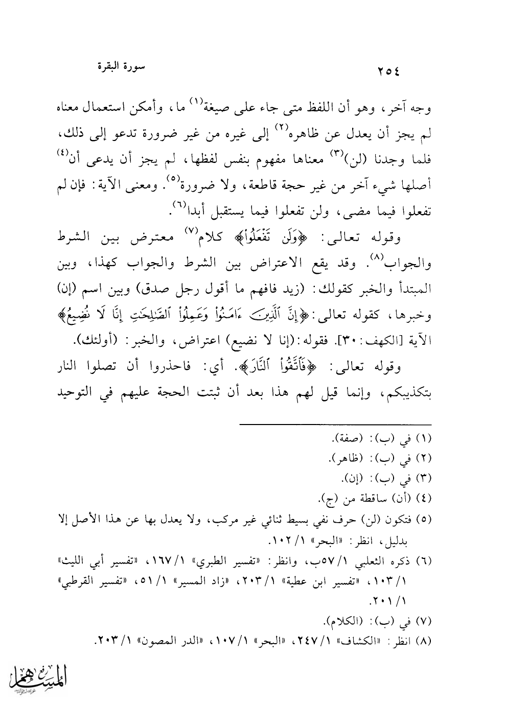 وقوله تعالى: {وَلَنْ تَفْعَلُوا} كلام (¬7) معترض بين الشرط والجواب (¬8). وقد يقع الاعتراض بين الشرط والجواب كهذا، وبين المبتدأ والخبر كقولك: (زيد فافهم ما أقول رجل صدق) وبين اسم (إن) وخبرها، كقوله تعالى: {إِنَّ الَّذِينَ آمَنُوا وَعَمِلُوا الصَّالِحَاتِ إِنَّا لَا نُضِيعُ} الآية [الكهف: 30]. فقوله: (إنا لا نضيع) اعتراض، والخبر: (أولئك).