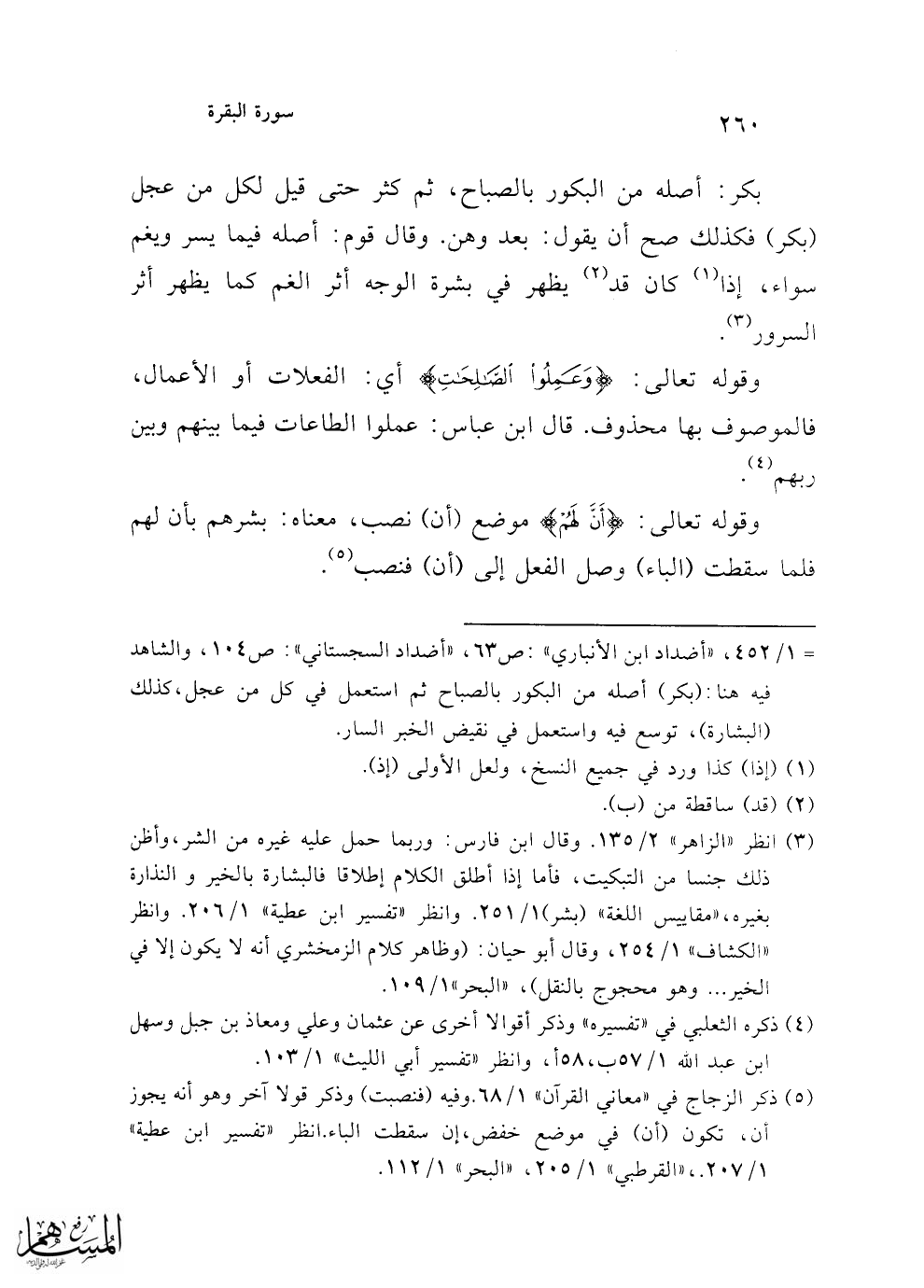= 1/ 452، "أضداد ابن الأنباري": ص 63، "أضداد السجستاني": ص104، والشاهد فيه هنا: (بكر) أصله من البكور بالصباح ثم استعمل في كل من عجل، كذلك (البشارة)، توسع فيه واستعمل في نقيض الخبر السار.
