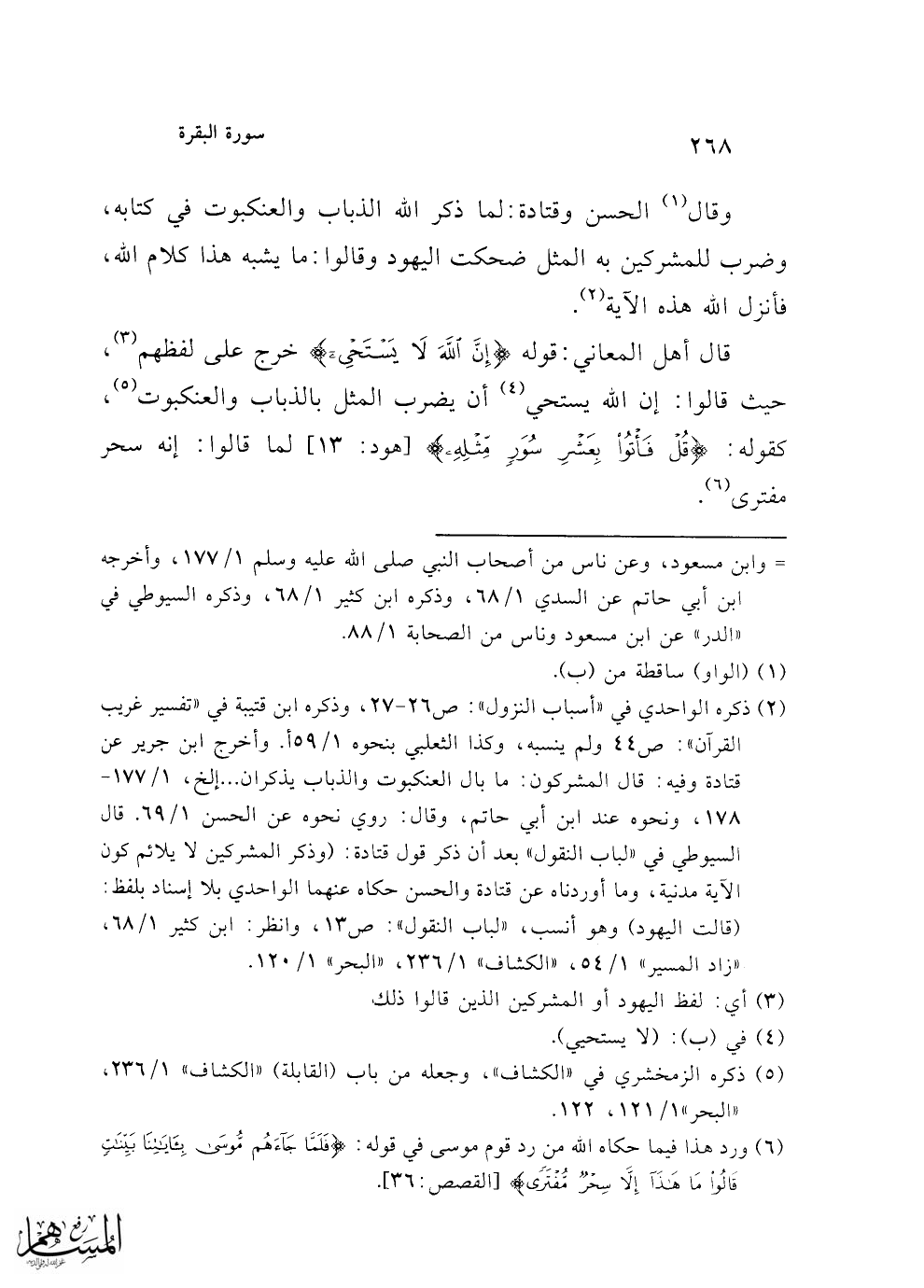 (¬2) ذكره الواحدي في "أسباب النزول": ص 26 - 27، وذكره ابن قتيبة في "تفسير غريب القرآن": ص 44 ولم ينسبه، وكذا الثعلبي بنحوه 1/ 59 أ. وأخرج ابن جرير عن قتادة وفيه: قال المشركون: ما بال العنكبوت والذباب يذكران ... إلخ، 1/ 177 - 178، ونحوه عند ابن أبي حاتم، وقال: روي نحوه عن الحسن 1/ 69. قال السيوطي في "لباب النقول" بعد أن ذكر قول قتادة: (وذكر المشركين لا يلائم كون الآية مدنية، وما أوردناه عن قتادة والحسن حكاه عنهما الواحدي بلا إسناد بلفظ: (قالت اليهود) وهو أنسب، "لباب النقول": ص 13، وانظر: ابن كثير 1/ 68، "زاد المسير" 1/ 54، "الكشاف" 1/ 236، "البحر" 1/ 120.