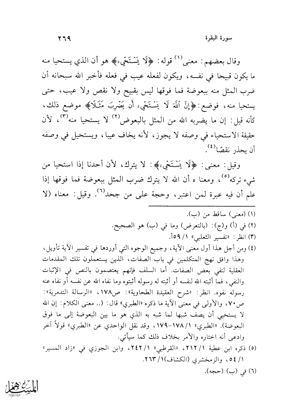 (¬4) ومن أجل هذا أول معنى الآية، وجميع الوجوه التي أوردها في تفسير الآية تأويل، وهذا وافق نهج المتكلمين في باب الصفات، الذين يستعملون تلك المقدمات العقلية لنفي بعض الصفات. أما السلف فإنهم يعتصمون بالنص في الإثبات والنفي، فما أثبته الله لنفسه أو أثبته له رسوله أثبتوه وما نفاه الله عن نفسه أو نفاه عنه رسوله نفوه. انظر: "شرح العقيدة الطحاوية": ص 178، "الرسالة التدمرية". ص 70، والأولى في معنى الآية ما ذكره "الطبري" قال: (.. معنى الكلام: إن الله لا يستحيي أن يصف شبها لما شبه به الذي هو ما بين البعوضة إلى ما فوق البعوضة). "الطبري" 1/ 178 - 179، وقد نقل الواحدي عن "الطبري" قولاً آخر وادعى أن اختاره والأمر بخلاف ذلك كما سيأتي.