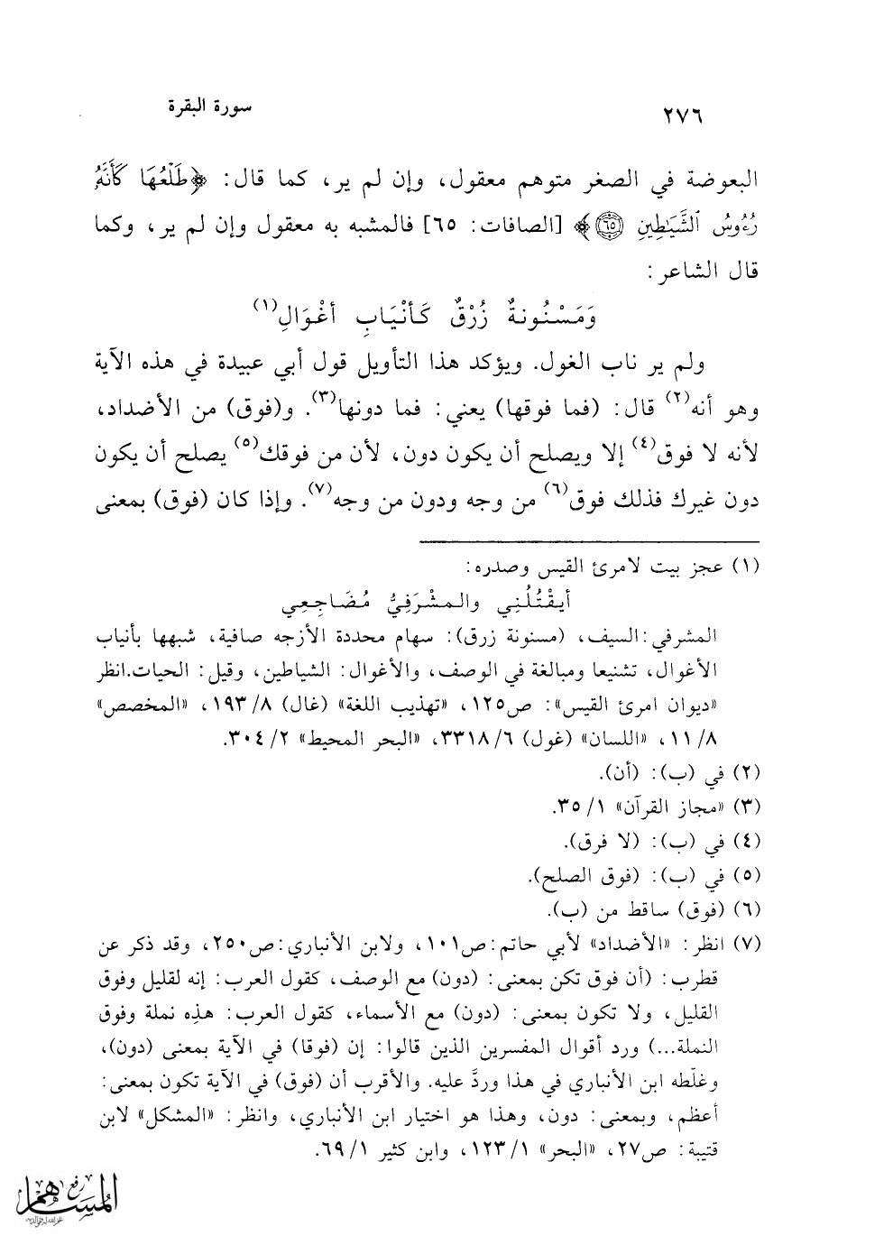 (¬7) انظر: "الأضداد" لأبي حاتم: ص101، ولابن الأنباري: ص 250، وقد ذكر عن قطرب: (أن فوق تكن بمعنى: (دون) مع الوصف، كقول العرب: إنه لقليل وفوق القليل، ولا تكون بمعنى: (دون) مع الأسماء، كقول العرب: هذِه نملة وفوق النملة ...) ورد أقوال المفسرين الذين قالوا: إن (فوقا) في الآية بمعنى (دون)، وغلّطه ابن الأنباري في هذا ورد عليه. والأقرب أن (فوق) في الآية تكون بمعنى: أعظم، وبمعنى: دون، وهذا هو اختيار ابن الأنباري، وانظر: "المشكل" لابن قتيبة: ص 27، "البحر" 1/ 123، وابن كثير 1/ 69.