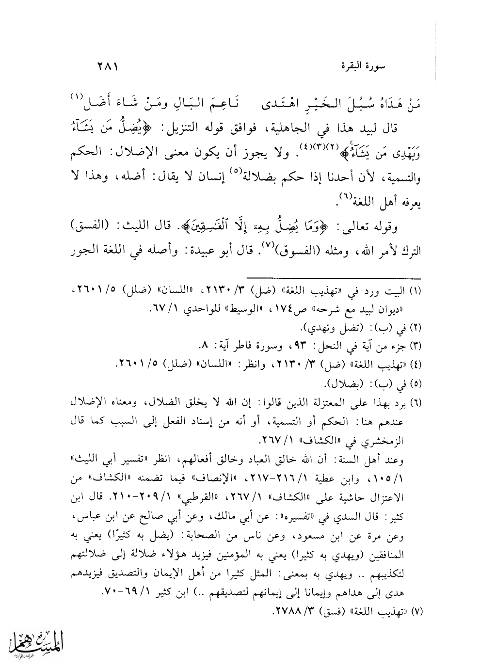 قال لبيد هذا في الجاهلية، فوافق قوله التنزيل: {يُضِلُّ مَنْ يَشَاءُ وَيَهْدِي مَنْ يَشَاءُ} (¬2) (¬3) (¬4). ولا يجوز أن يكون معنى الإضلال: الحكم والتسمية، لأن أحدنا إذا حكم بضلالة (¬5) إنسان لا يقال: أضله، وهذا لا يعرفه أهل اللغة (¬6).