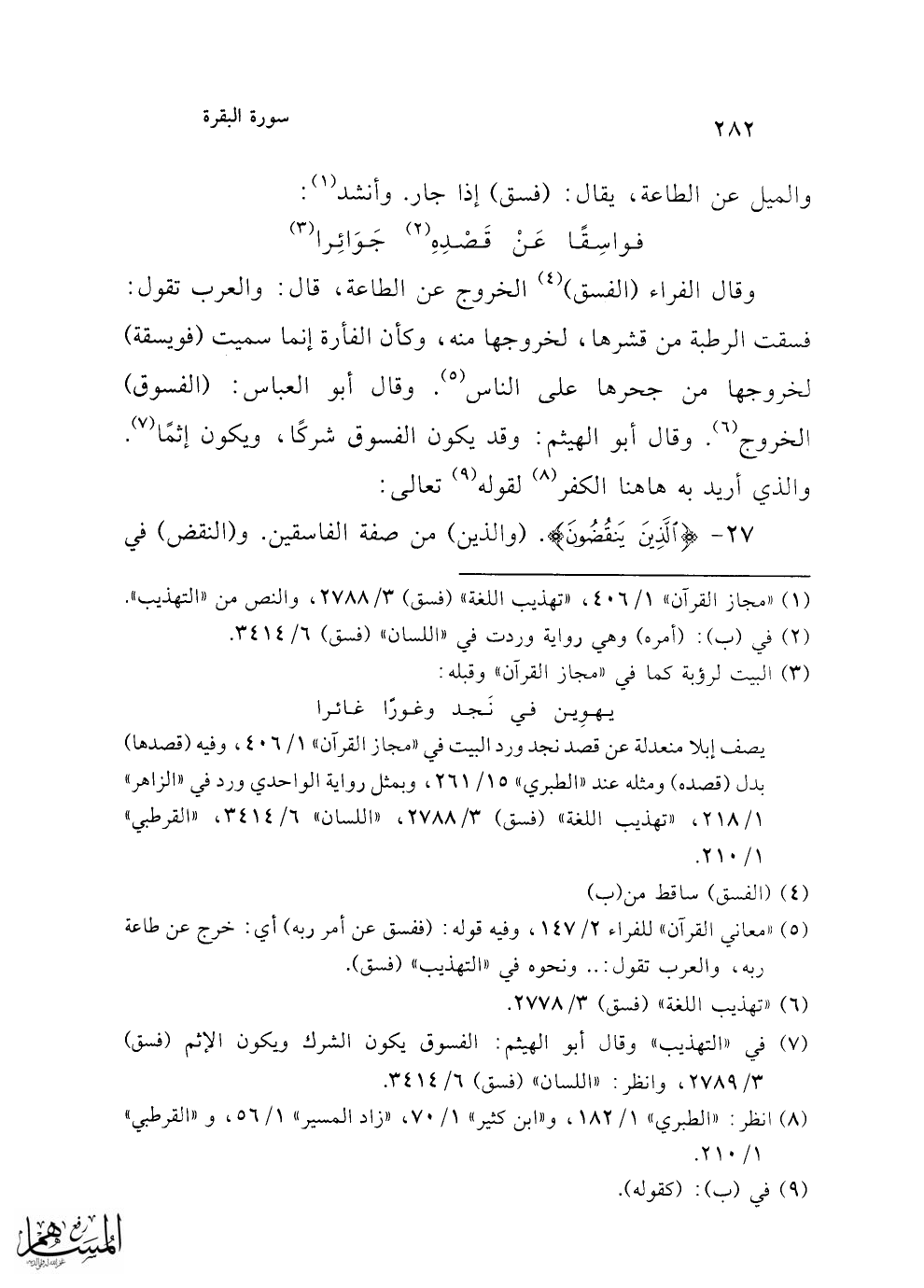 (¬1) "مجاز القرآن" 1/ 406، "تهذيب اللغة" (فسق) 3/ 2788، والخص من "التهذيب".