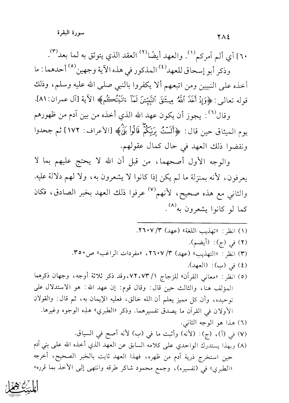 (¬8) وبهذا يستدرك الواحدي على كلامه السابق عن العهد الذي أخذه الله على بني آدم حين استخرج ذرية آدم من ظهره، فهذا العهد ثابت بالخبر الصحيح، أخرجه "الطبري" في (تفسيره)، وجمع محمود شاكر طرقه وانتهى إلى الأخذ بما قرره =
