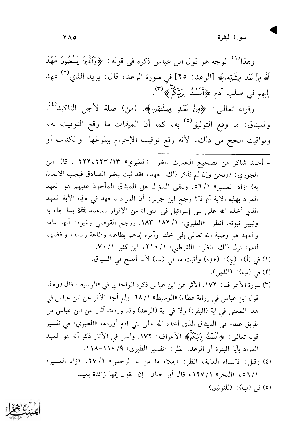 (¬3) سورة الأعراف: 172. الأثر عن ابن عباس ذكره الواحدي في "الوسيط" قال (وهذا قول ابن عباس في رواية عطاء) "الوسيط" 1/ 68. ولم أجد الأثر عن ابن عباس في هذا المعنى في آية (البقرة) ولا في آية (الرعد) وقد وردت آثار عن ابن عباس من طريق عطاء في الميثاق الذي أخذه الله على بني آدم أوردها "الطبري" في تفسير قوله تعالى: {أَلَسْتُ بِرَبِّكُمْ} [الأعراف: 172] وليس في الآثار ذكر أنه هو العهد المراد بآية البقرة أو الرعد. انظر: "تفسير الطبري" 9/ 110 - 118.