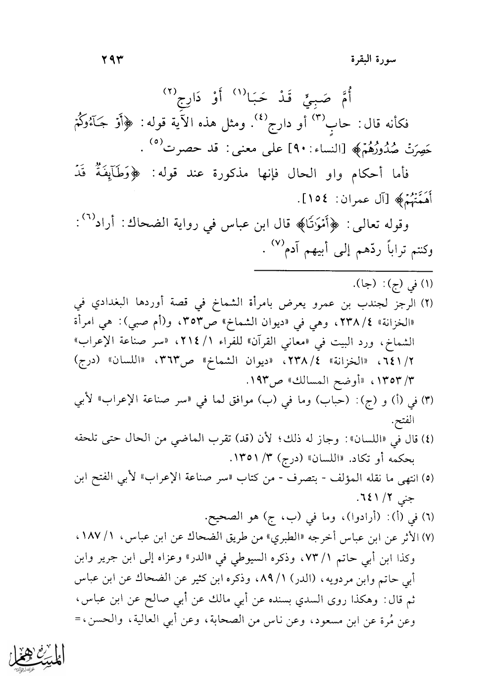 فكأنه قال: حابٍ (¬3) أو دارج (¬4). ومثل هذه الآية قوله: {أَوْ جَاءُوكُمْ حَصِرَتْ صُدُورُهُمْ} [النساء: 90] على معنى: قد حصرت (¬5).