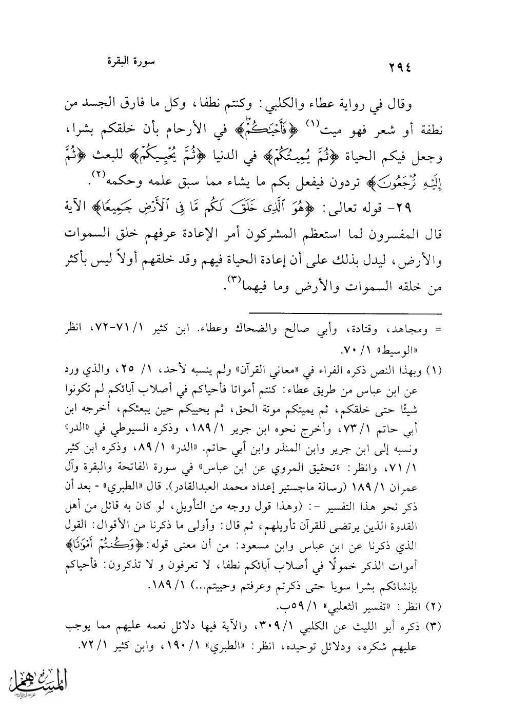 (¬1) وبهذا النص ذكره الفراء في "معاني القرآن" ولم ينسبه لأحد، 1/ 25، والذي ورد عن ابن عباس من طريق عطاء: كنتم أمواتا فأحياكم في أصلاب آبائكم لم تكونوا شيئًا حتى خلقكم، ثم يميتكم موتة الحق، ثم يحييكم حين يبعثكم، أخرجه ابن أبي حاتم 1/ 73، وأخرج نحوه ابن جرير 1/ 189، وذكره السيوطي في "الدر" ونسبه إلى ابن جرير وابن المنذر وابن أبي حاتم. "الدر" 1/ 89، وذكره ابن كثير 1/ 71، وانظر: "تحقيق المروي عن ابن عباس" في سورة الفاتحة والبقرة وآل عمران 1/ 189 (رسالة ماجستير إعداد محمد العبد القادر). قال "الطبري" -بعد أن ذكر نحو هذا التفسير-: (وهذا قول ووجه من التأويل، لو كان به قائل من أهل القدوة الذين يرتضى للقرآن تأويلهم، ثم قال: وأولى ما ذكرنا من الأقوال: القول الذي ذكرنا عن ابن عباس وابن مسعود: من أن معنى قوله: {وَكُنْتُمْ أَمْوَاتًا} أموات الذكر خمولًا في أصلاب أبائكم نطفا، لا تعرفون ولا تذكرون: فأحياكم بإنشائكم بشرا سويا حتى ذكرتم وعرفتم وحييتم ...) 1/ 189.