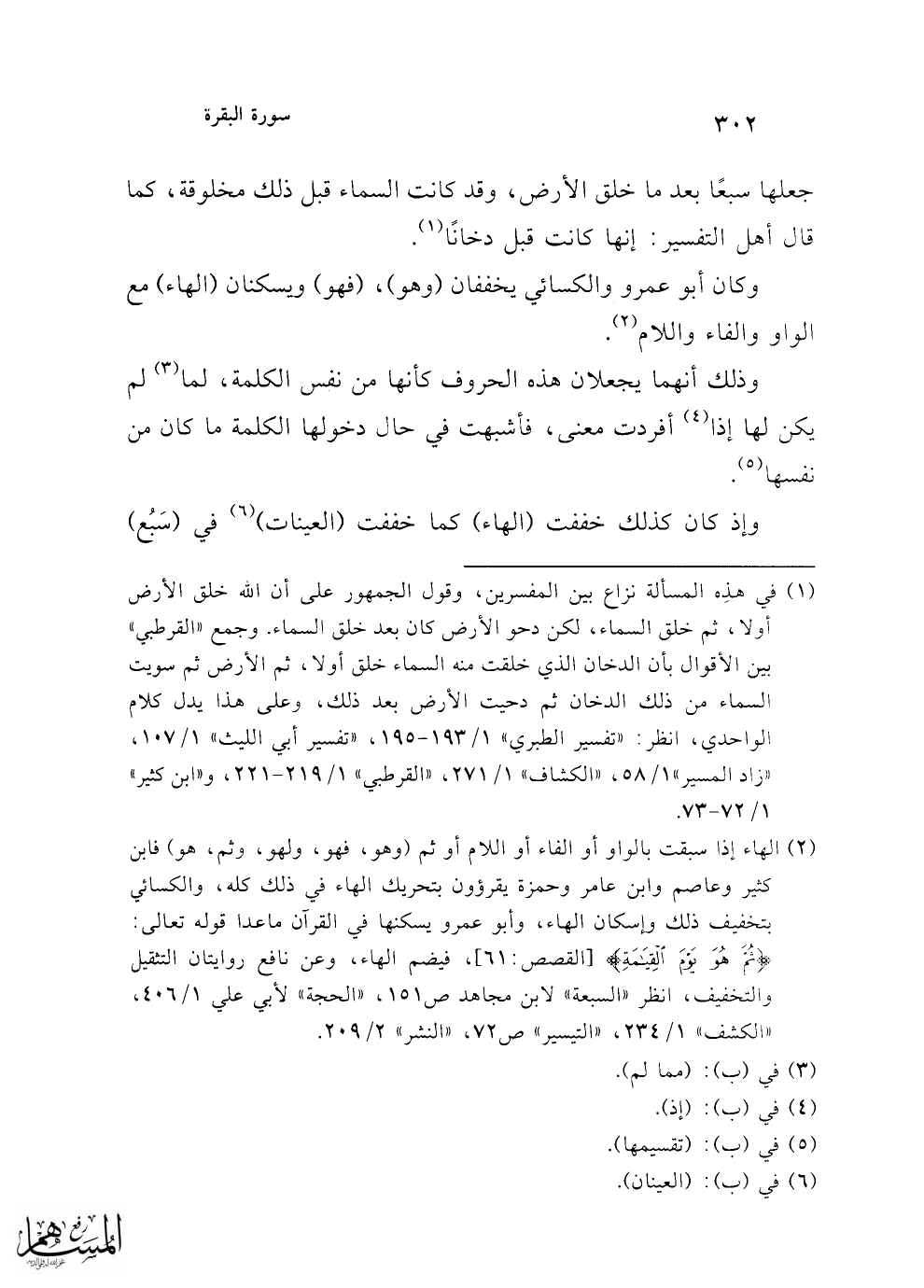 (¬2) الهاء إذا سبقت بالواو أو الفاء أو اللام أو ثم (وهو، فهو، ولهو، وثم، هو) فابن كثير وعاصم وابن عامر وحمزة يقرؤون بتحريك الهاء في ذلك كله، والكسائي بتخفيف ذلك وإسكان الهاء، وأبو عمرو يسكنها في القرآن ماعدا قوله تعالى: {ثُمَّ هُوَ يَوْمَ الْقِيَامَةِ} [القصص: 61]، فيضم الهاء، وعن نافع روايتان التثقيل والتخفيف، انظر "السبعة" لابن مجاهد ص 151، "الحجة" لأبي علي 1/ 406، "الكشف" 1/ 234، "التيسير" ص 72، "النشر" 2/ 209.