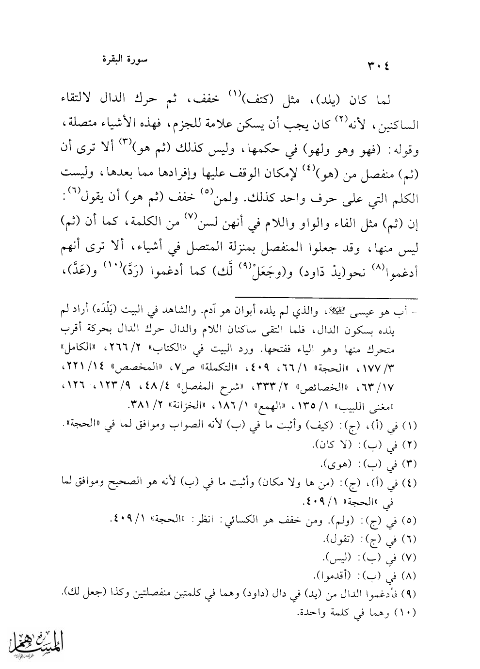 لما كان (يلد)، مثل (كتف) (¬1) خفف، ثم حرك الدال لالتقاء الساكنين، لأنه (¬2) كان يجب أن يسكن علامة للجزم، فهذه الأشياء متصلة، وقوله: (فهو وهو ولهو) في حكمها، وليس كذلك (ثم هو) (¬3) ألا ترى أن (ثم) منفصل من (هو) (¬4) لإمكان الوقف عليها وإفرادها مما بعدها، وليست الكلم التي على حرف واحد كذلك. ولمن (¬5) خفف (ثم هو) أن يقول (¬6): إن (ثم) مثل الفاء والواو واللام في أنهن لسن (¬7) من الكلمة، كما أن (ثم) ليس منها، وقد جعلوا المنفصل بمنزلة المتصل في أشياء، ألا ترى أنهم أدغموا (¬8) نحو (يدْ دّاود) و (وجَعَلْ (¬9) لَّك) كما أدغموا (رَدَّ) (¬10) و (عَدَّ)،