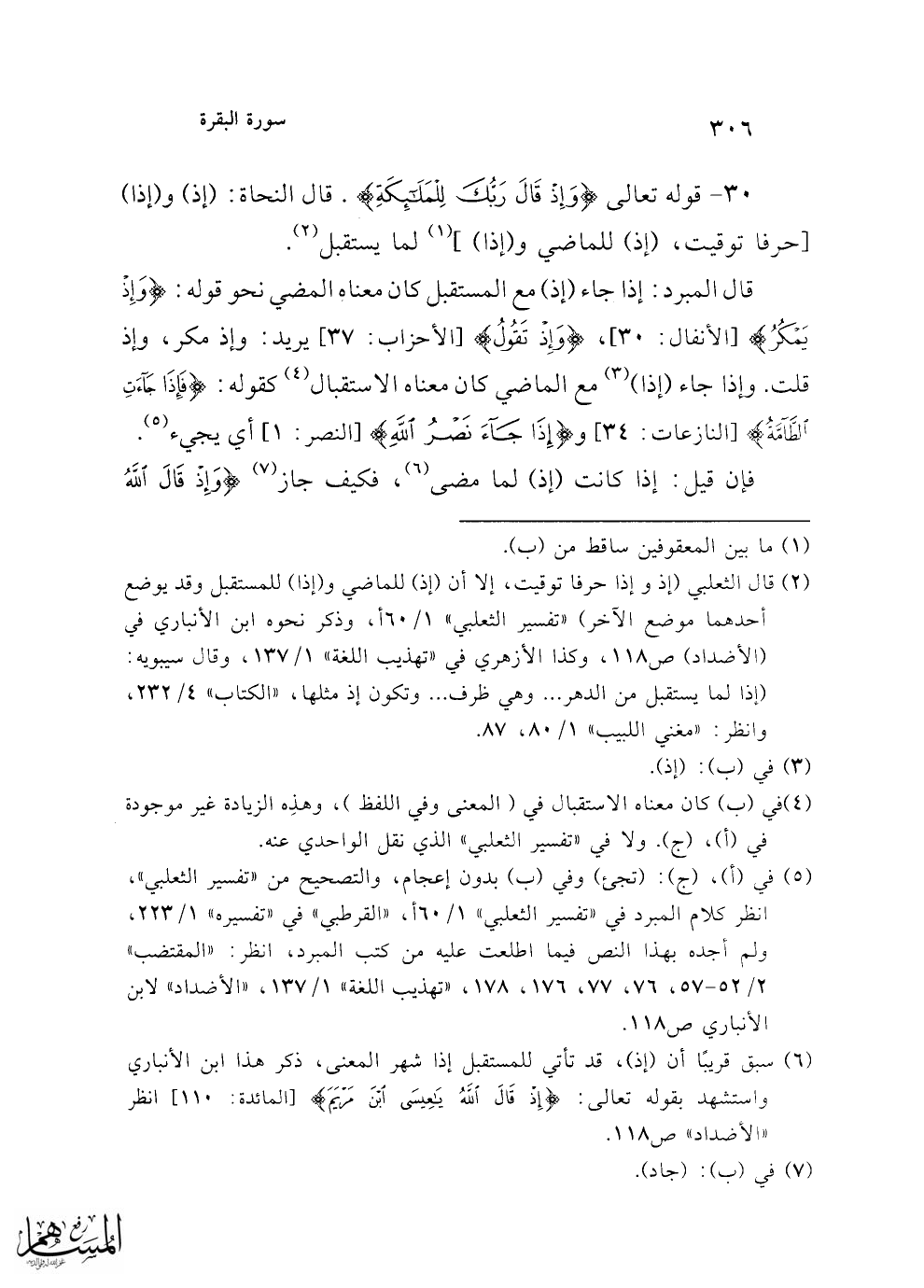 (¬6) سبق قريبًا أن (إذ)، قد تأتي للمستقبل إذا شهر المعنى، ذكر هذا ابن الأنباري واستشهد بقوله تعالى: {إِذْ قَالَ اللَّهُ يَا عِيسَى ابْنَ مَرْيَمَ} [المائدة: 110] انظر "الأضداد" ص 118.