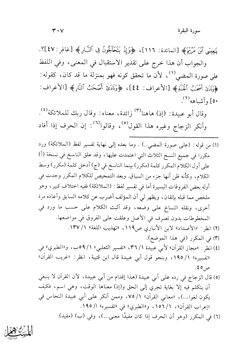 (¬5) قال الزجاج في رده على أبي عبيدة (هذا إقدام من أبي عبيدة، لأن القرآن لا ينبغي أن يتكلم فيه إلا بغاية تجري إلى الحق و (إذ) معناها الوقت، وهي اسم، فكيف يكون لغوا ...)، "معاني القرآن" 1/ 75، وممن أنكر على أبي عبيدة النحاس في "إعراب القرآن"، 1/ 156، و"الطبري" في "تفسيره" 1/ 195.