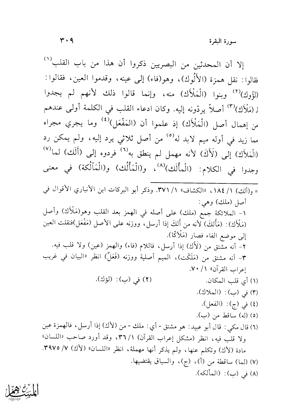 (¬6) قال مكي: قال أبو عبيد: هو مشتق -أي: ملك- من (لأك) إذا أرسل، فالهمزة عين ولا قلب فيه، انظر (مشكل إعراب القرآن) 1/ 36، وقد أورد صاحب "اللسان" مادة (لأك) وتكلم عنها، ولم يذكر أنها مهملة، انظر "اللسان" (لأك) 7/ 3975.